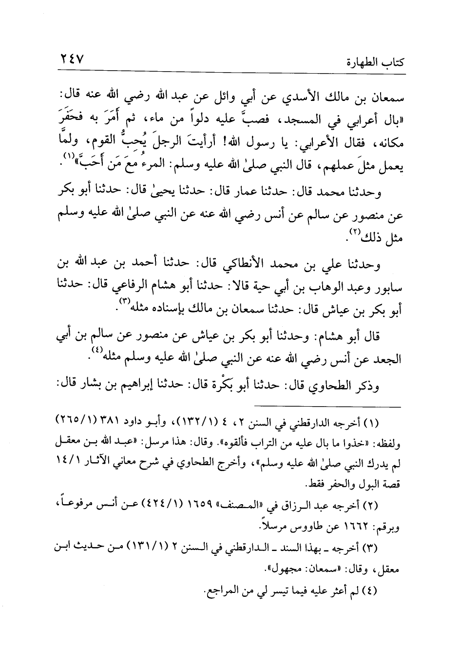 سمعان بن مالك الأسدي عن أبي وائل عن عبد الله رضي الله عنه قال: "بال أعرابي في المسجد، فصب عليه دلوًا من ماء، ثم أمر به فحفر مكانه، فقال الأعرابي: يا رسول الله! أرأيت الرجل يحب القوم، ولما يعمل مثل عملهم، قال النبي صلى الله عليه وسلم: المرء مع من أحب".