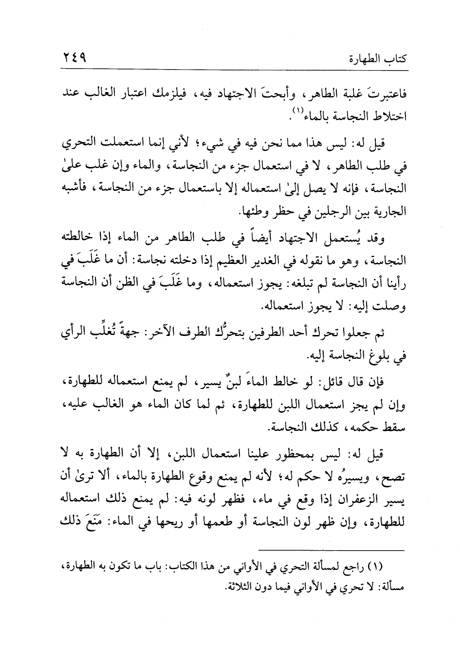 وقد يستعمل الاجتهاد أيضًا في طلب الطاهر من الماء إذا خالطته النجاسة، وهو ما نقوله في الغدير العظيم إذا دخلته نجاسة: أن ما غلب في رأينا أن النجاسة لم تبلغه: يجوز استعماله، وما غلب في الظن أن النجاسة وصلت إليه: لا يجوز استعماله.