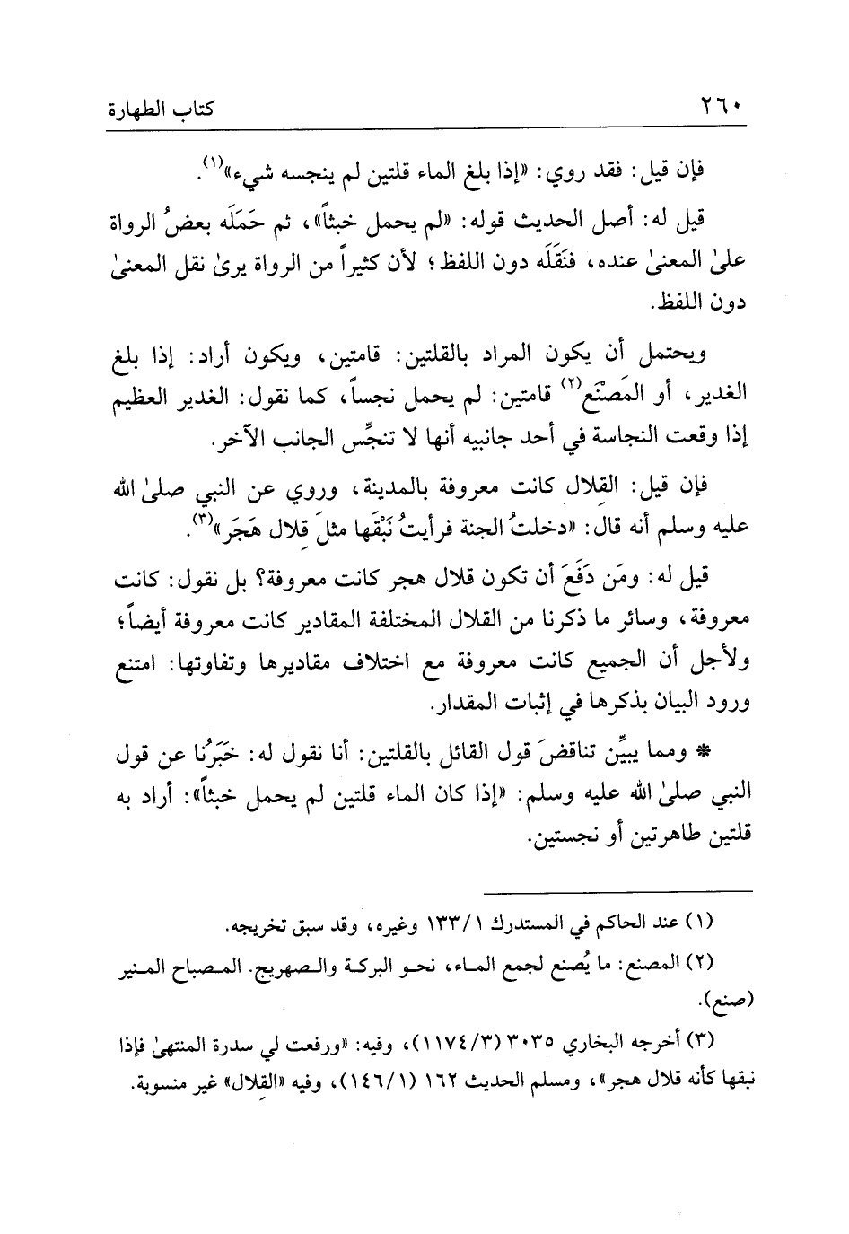 * ومما يبين تناقض قول القائل بالقلتين: أنا نقول له: خبرنا عن قول النبي صلى الله عليه وسلم: "إذا كان الماء قلتين لم يحمل خبثًا": أراد به قلتين طاهرتين أو نجستين.