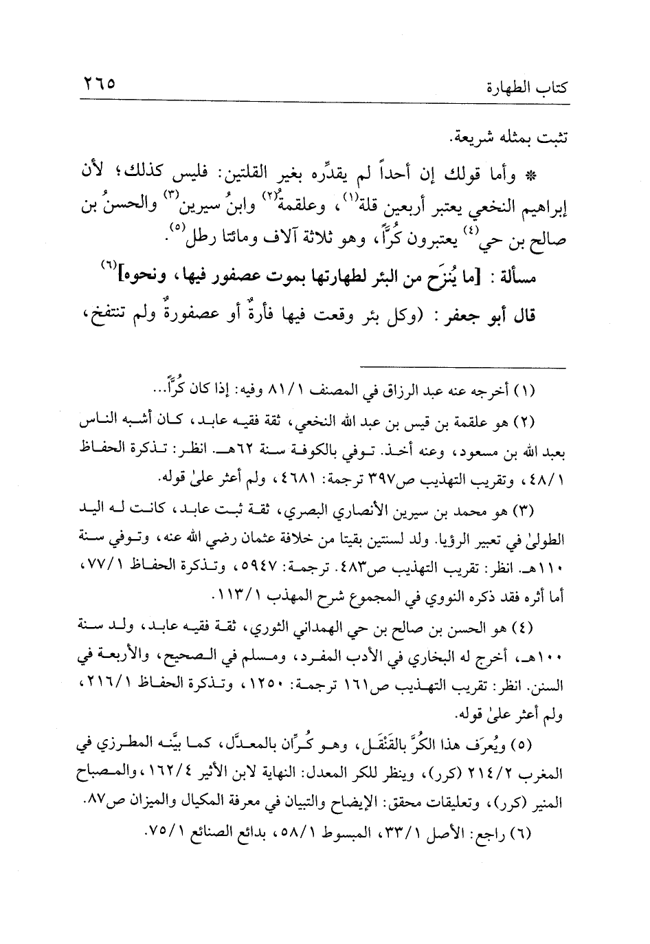 * وأما قولك إن أحدًا لم يقدره بغير القلتين: فليس كذلك؛ لأن إبراهيم النخعي يعتبر أربعين قلة، وعلقمة وابن سيرين والحسن بن صالح بن حي يعتبرون كرًا، وهو ثلاثة آلاف ومائتا رطل.