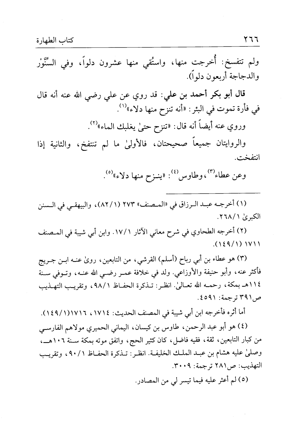 قال أبو بكر أحمد بن علي: قد روي عن علي رضي الله عنه أنه قال في فأرة تموت في البئر: "أنه تنزح منها دلاء".