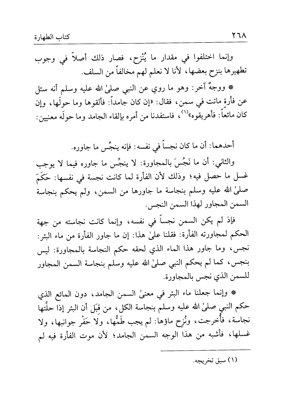 * وإنما جعلنا ماء البئر في معنى السمن الجامد، دون المائع الذي حكم النبي صلى الله عليه وسلم بنجاسة الكل، من قبل أن البئر إذا حلتها نجاسة، فأخرجت، ونزح ماؤها: لم يجب طمها، ولا حفر جوانبها، ولا غسلها، فأشبه من هذا الوجه السمن الجامد؛ لأن موت الفأرة فيه لم