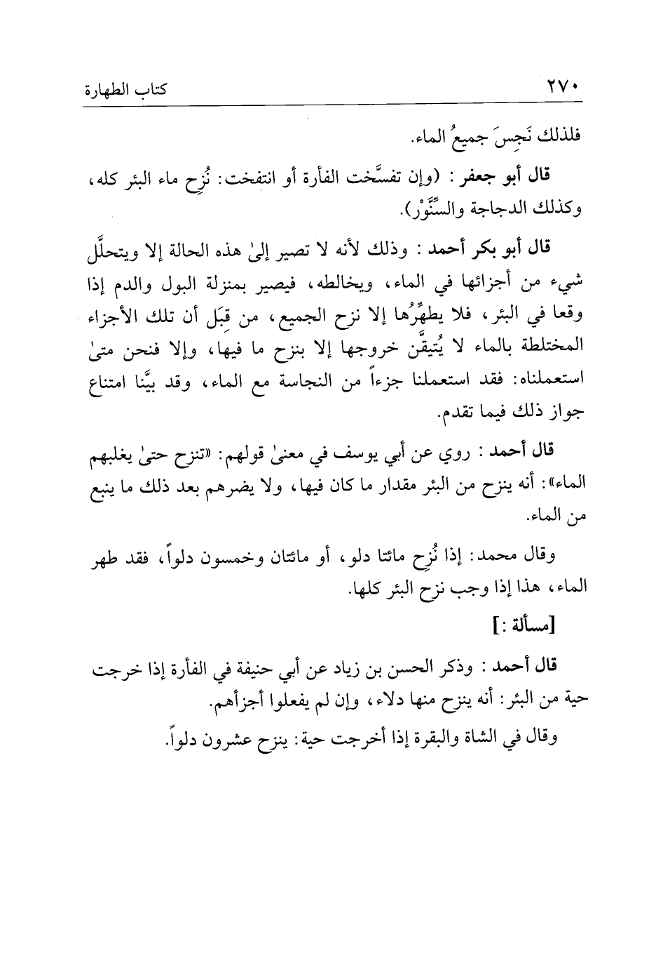 قال أحمد: روي عن أبي يوسف في معنى قولهم: "تنزح حتى يغلبهم الماء": أنه ينزح من البئر مقدار ما كان فيها، ولا يضرهم بعد ذلك ما ينبع من الماء.