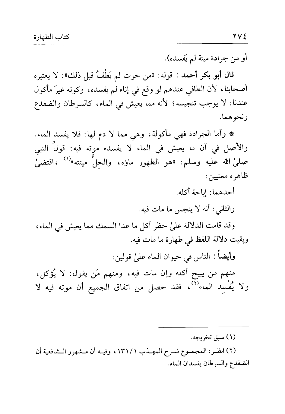 * وأما الجرادة فهي مأكولة، وهي مما لا دم لها: فلا يفسد الماء والأصل في أن ما يعيش في الماء لا يفسده موته فيه: قول النبي صلى الله عليه وسلم: "هو الطهور ماؤه، والحل ميتة"، اقتضى ظاهره معنيين.