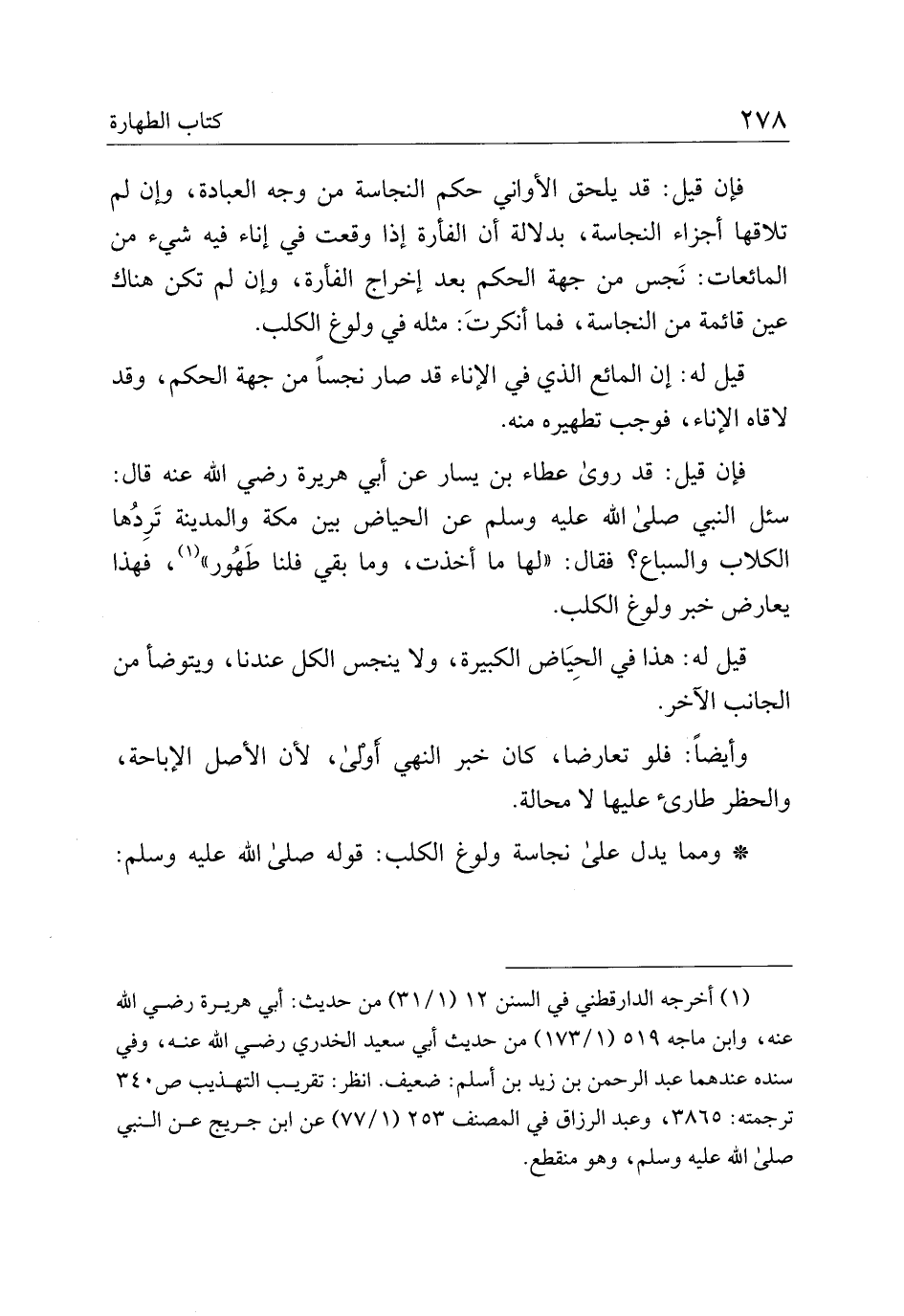 فإن قيل: قد روى عطاء بن يسار عن أبي هريرة رضي الله عنه قال: سئل النبي صلى الله عليه وسلم عن الحياض بين مكة والمدينة تردها الكلاب والسباع؟ فقال: "لها ما أخذت، وما بقي فلنا طهور"، فهذا يعارض خبر ولوغ الكلب.