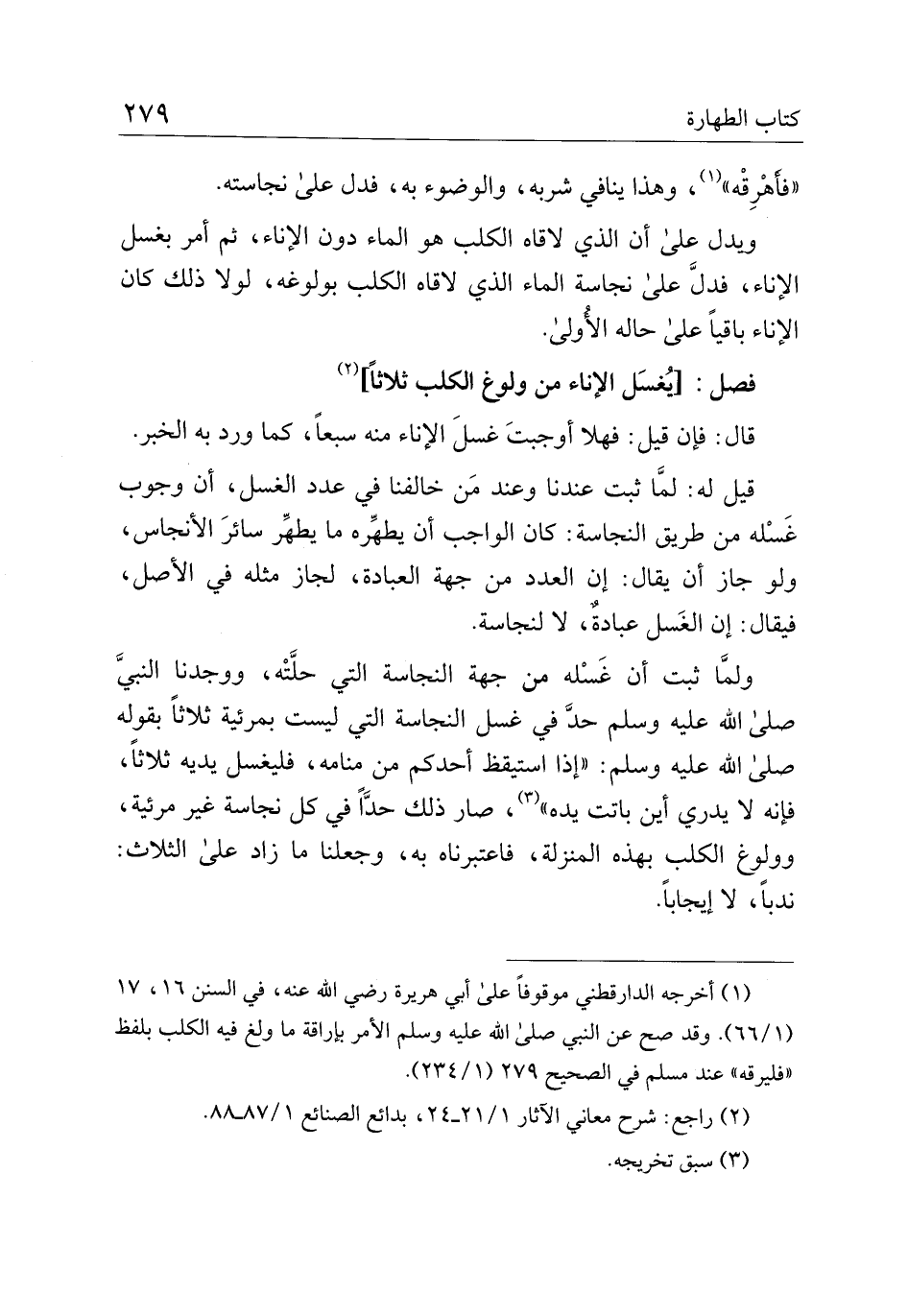 ولما ثبت أن غسله من جهة لنجاسة التي حلته، ووجدنا النبي صلى الله عليه وسلم حد في غسل النجاسة التي ليست بمرئية ثلاثًا بقوله صلى الله عليه وسلم: "إذا استيقظ أحدكم من منامه، فليغسل يديه ثلاثًا، فإنه لا يدري أين باتت يده"، صار ذلك حدًا في كل نجاسة غير مرئية، وولوغ الكلب بهذه المنزلة، فاعتبرناه به، وجعلناه ما زاد على الثلاث: ندبًا، لا إيجابًا.