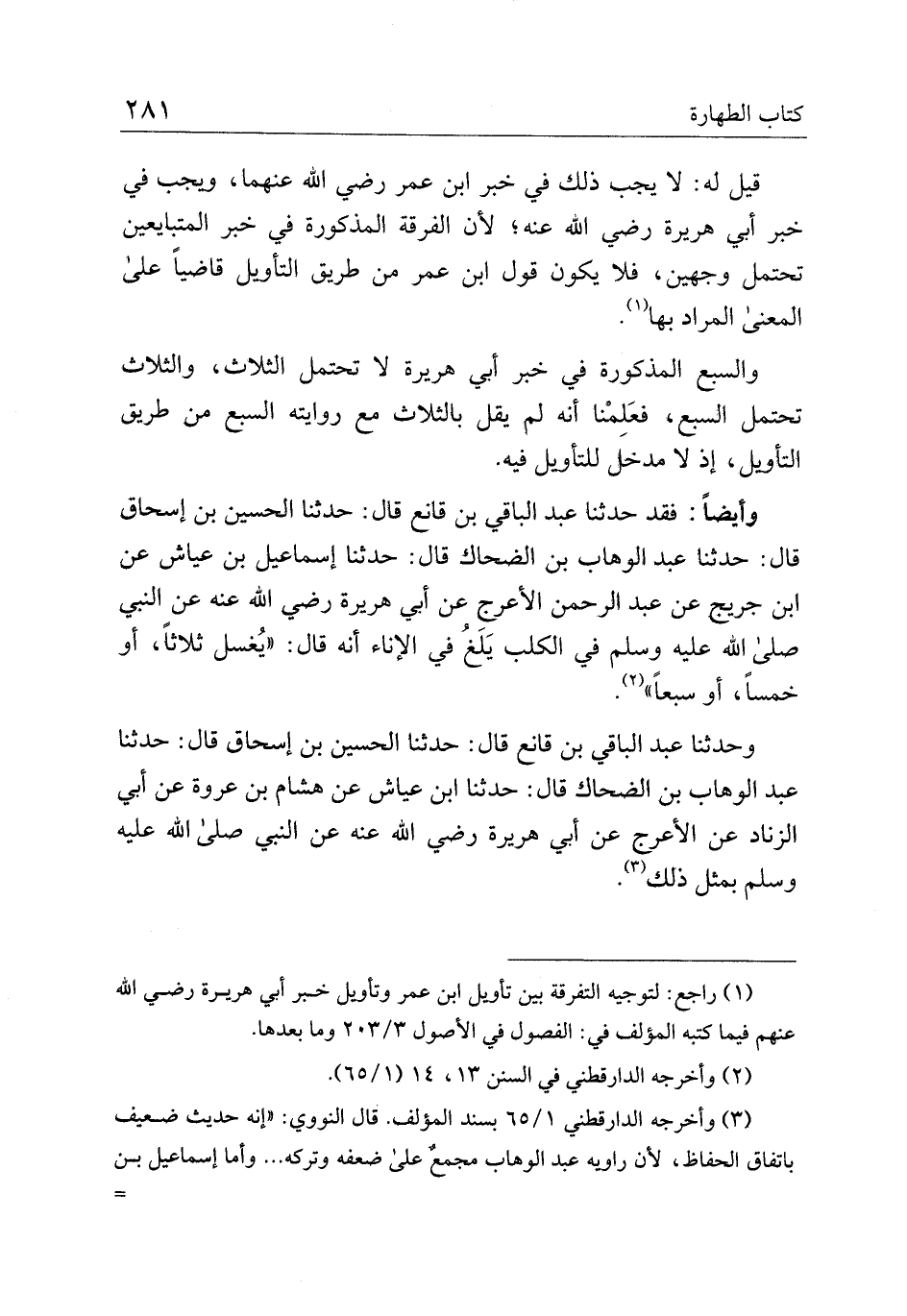 والسبع المذكورة في خبر أبي هريرة لا تحتمل الثلاث، والثلاث تحتمل السبع، فعلمنا أنه لم يقل بالثلاث مع روايته السبع من طريق التأويل، إذ لا مدخل للتأويل فيه.