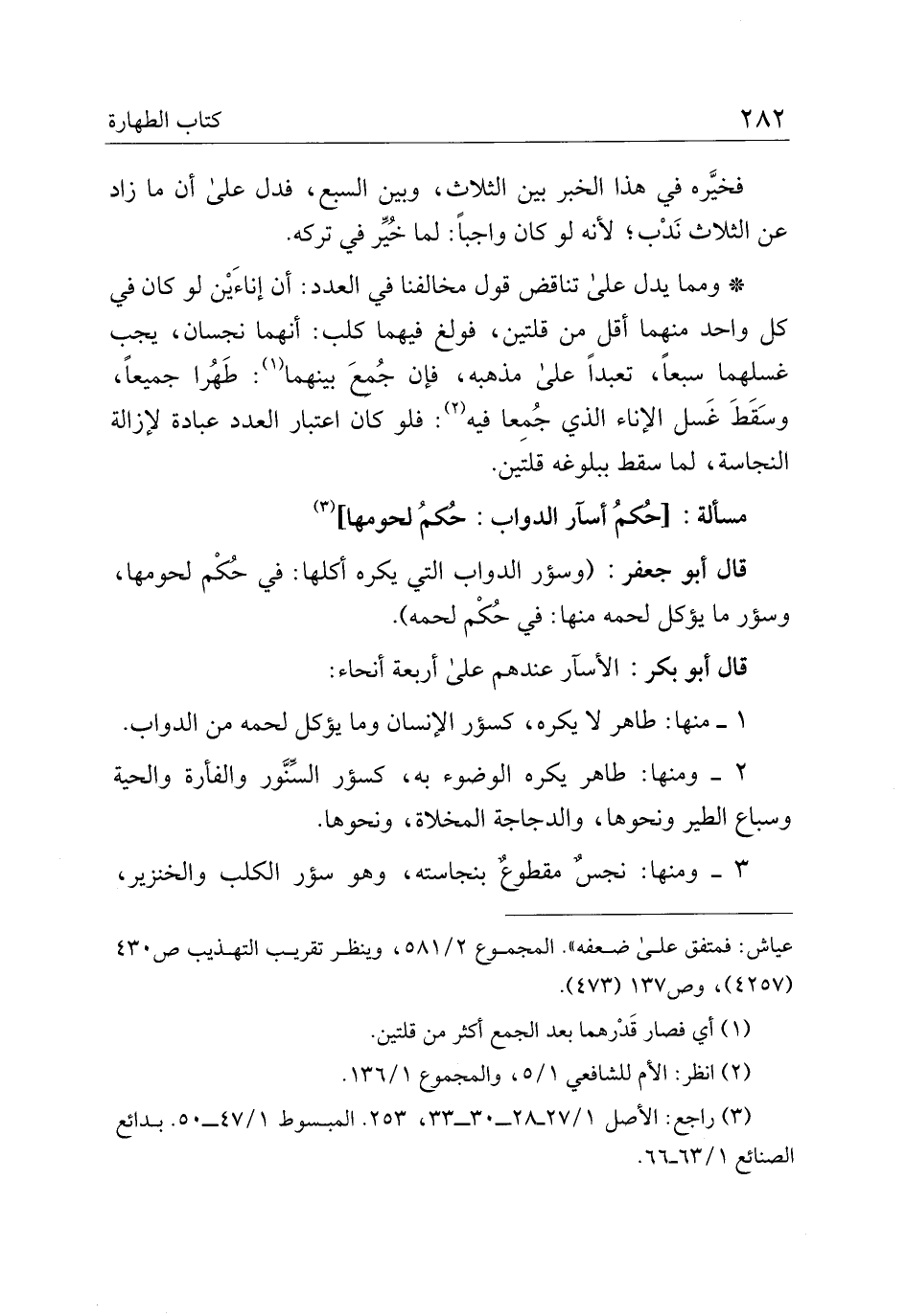 قال أبو جعفر: (وسؤر الدواب التي يكره أكلها: في حكم لحومها، وسؤر ما يؤكل لحمه منها: في حكم لحمه).