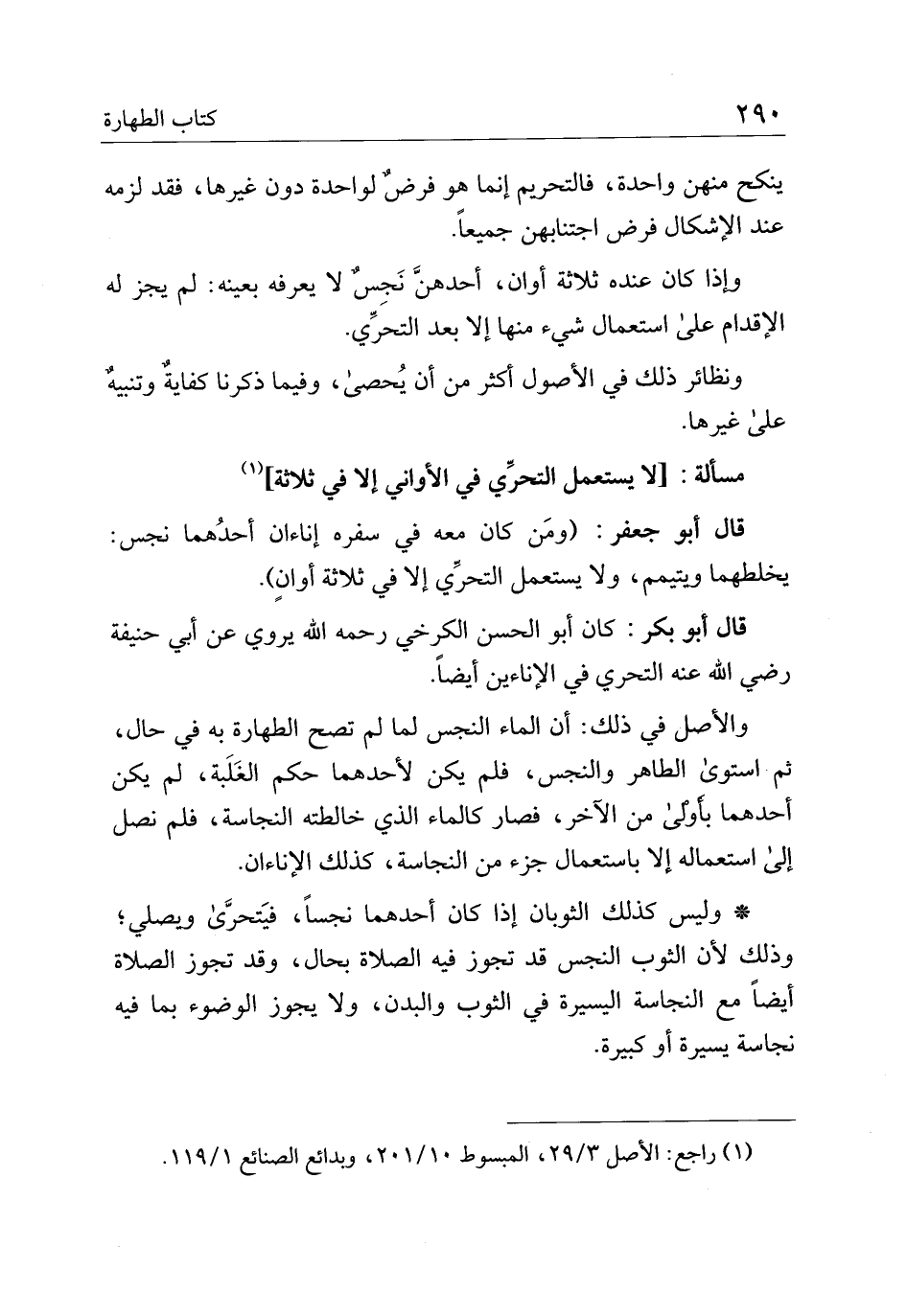 قال أب جعفر: (ومن كان معه في سفره إناءان أحدهما نجس يخلطهما ويتيمم، ولا يستعمل التحري إلا في ثلاثة أوان).
