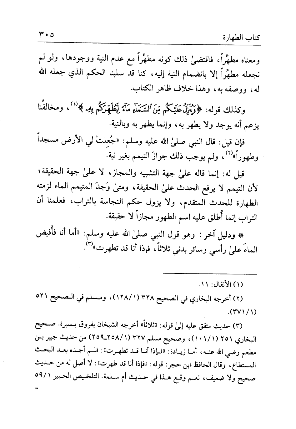 ومعناه مطهراَ، فاقتضى ذلك كونه مطهرًا مع عدم النية ووجودها، ولو لم نجعلة مطهرًا إلا بانضمام النية إليه، كنا قد سلبنا الحكم الذي جعله الله له، ووصفه به، وهذا خلاف ظاهر الكتاب.