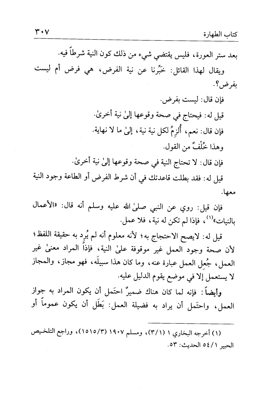 فإن قال: نعم، ألزم لكل نية نية، إلى ما لا نهاية. وهذا خلف من القول.