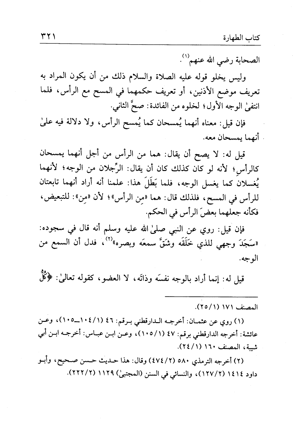 وليس يخلو قوله عليه الصلاة والسلام ذلك من أن يكون المراد به تعريف موضع الأذنين, أو تعريف حكمهما في المسح مع الرأس, فلما انتفى الوجه الأول, لخلوه من الفائدة: صح الثاني.