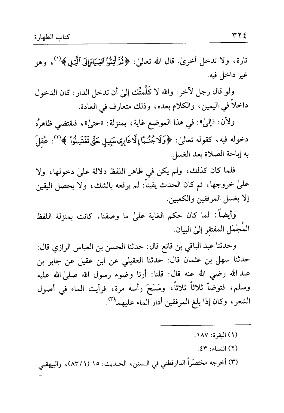 فلما كان كذلك, ولم يكن في ظاهر اللفظ دلالة على دخولها, ولا على خروجها, ثم كان الحديث يقينًا: لم يرفعه بالشك, ولا يحصل اليقين إلا بغسل المرفقين والكعبين.