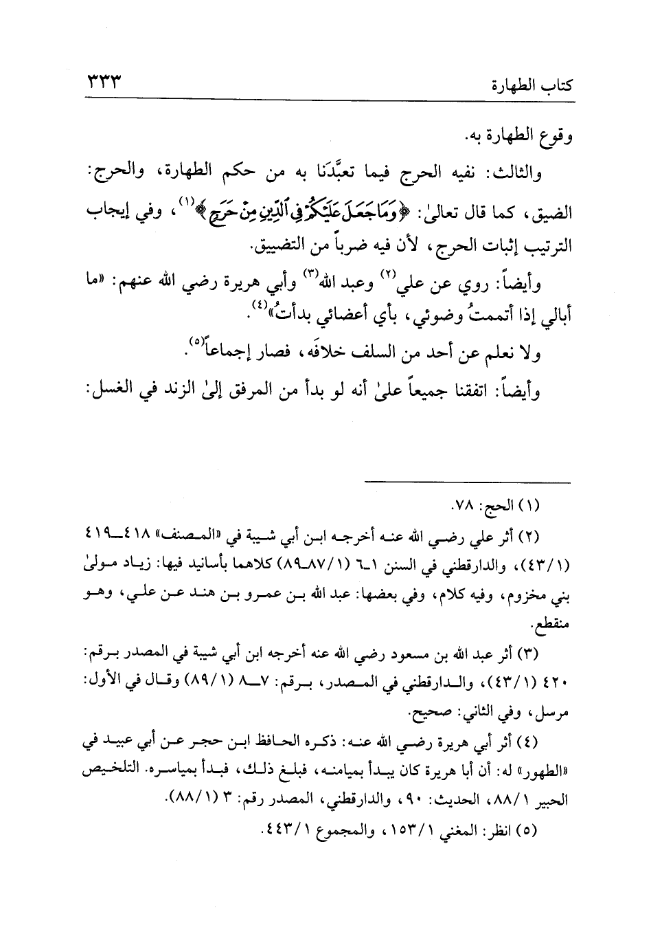 وأيضا: روي عن علي وعبد الله وأبي هريرة رضي الله عنهم: "ما أبالي إذا أتممت وضوئي، بأي أعضائي بدأت".