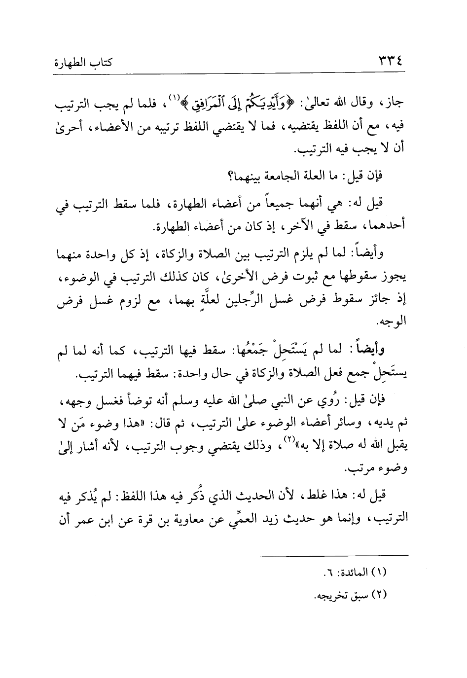 وأيضا: لما لم يلزم الترتيب بين الصلاة والزكاة، إذ كل واحدة منهما يجوز سقوطها مع ثبوت فرض الأخرى، كان كذلك الترتيب في الوضوء.