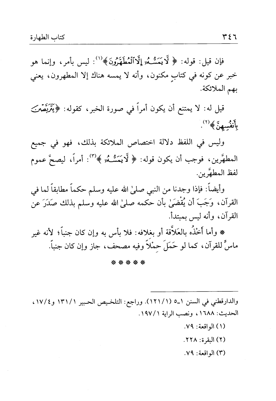 وليس في اللفظ دلالة اختصاص الملائكة بذلك، فهو في جميع المطهرين، فوجب أن يكون قوله:} لا يمسه {: أمرا، ليصح عموم لفظ المطهرين.