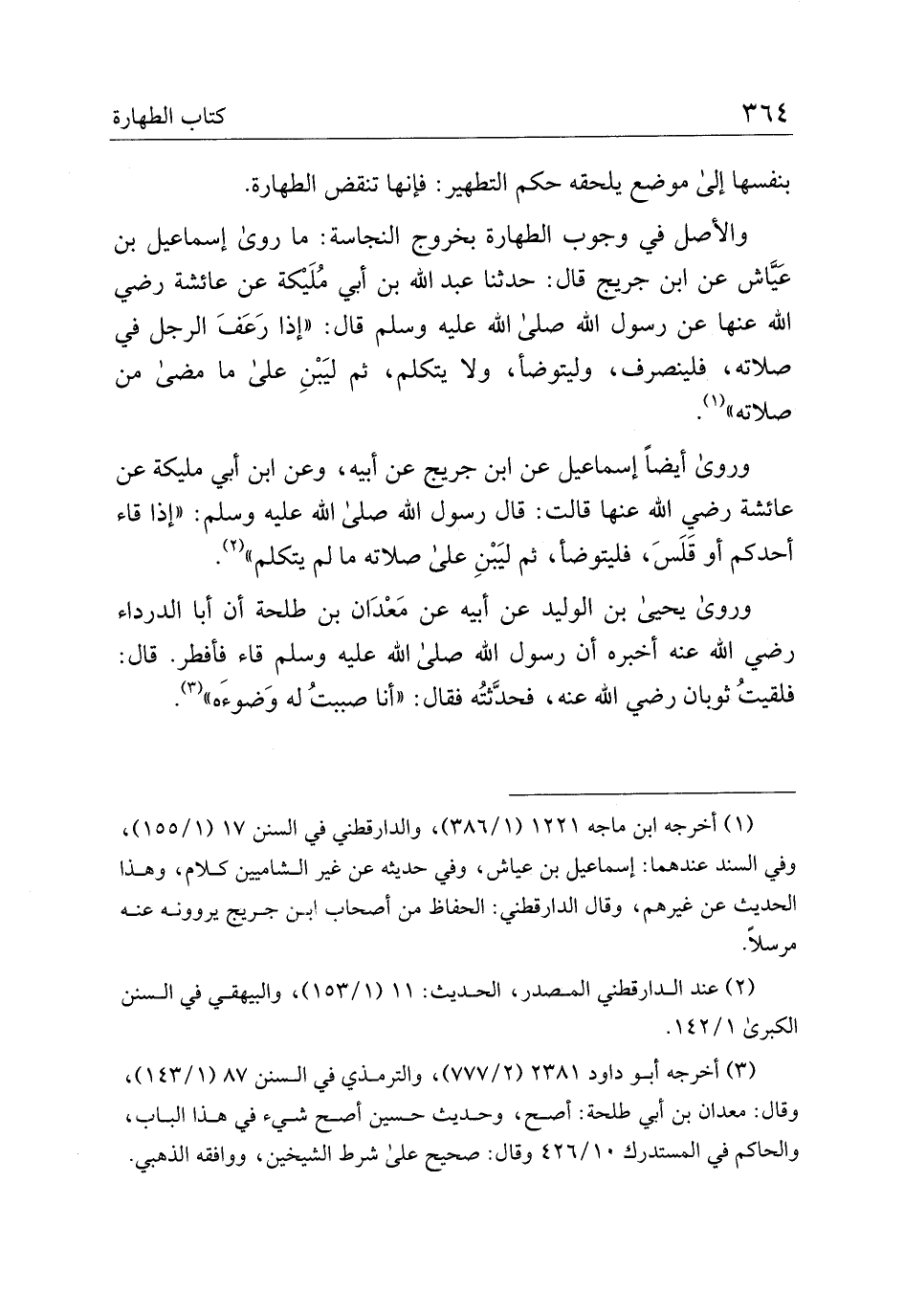 وروى أيضًا إسماعيل عن ابن جريج عن أبيه، وعن ابن أبي مليكة عن عائشة رضي الله عنها قالت: قال رسول الله صلى الله عليه وسلم: "إذا قاء أحدكم أو قلس، فليتوضأ، ثم ليبن على صلاته ما لم يتكلم".