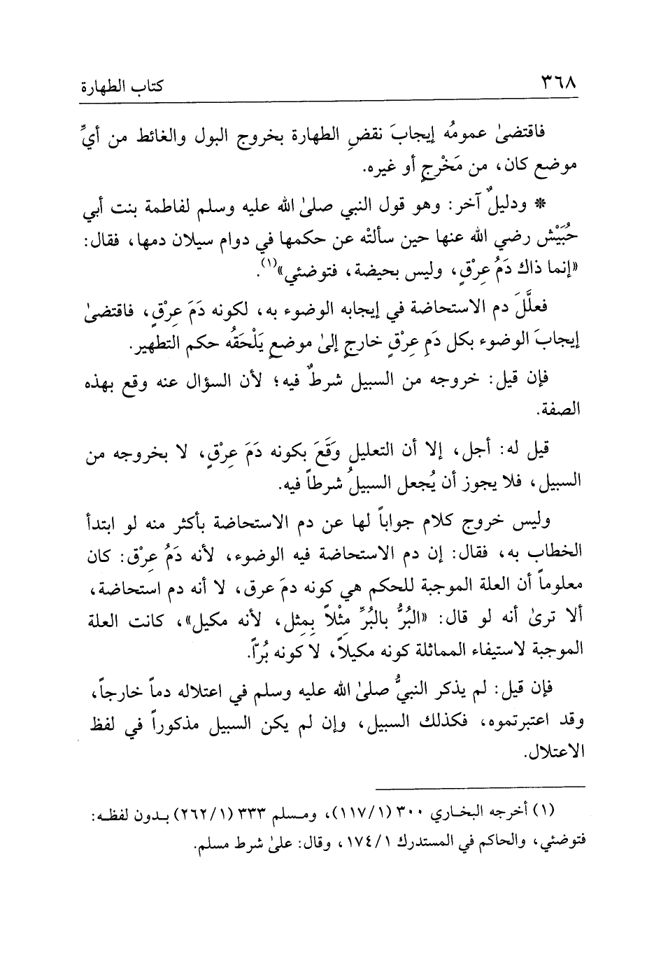 وليس خروج كلام جوابا لها عن دم الاستحاضة بأكثر منه لو ابتدأ الخطاب به، فقال: إن دم الاستحاضة فيه وضوء، لأنه دم عرق: كان معلوما أن العلة الموجبة للحكم هي كونه دم عرق، لا أنه دم استحاضة، ألا ترى أنه لو قال: "البر بالبر مثلا بمثل، لأنه مكيل"، كانت العلة الموجبة لاستيفاء المماثلة كونه مكيلًا، لا كونه برا.