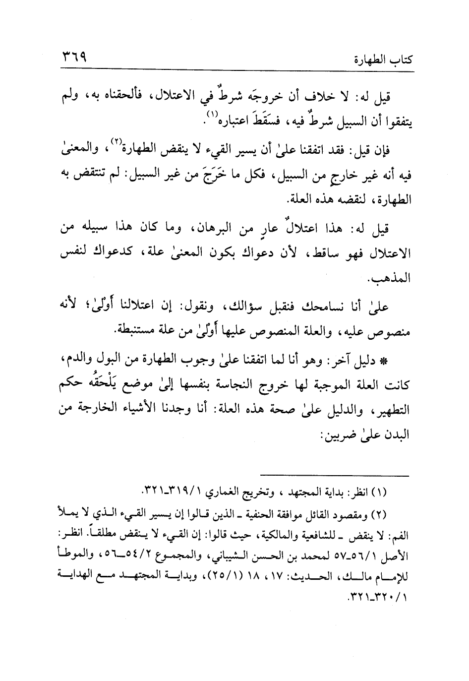 *دليل آخر: وهو أنا لما اتفقنا على وجوب الطهارة من البول والدم، كانت العلة الموجبة لها خروج النجاسة بنفسها إلى موضع يلحقه حكم التطهير، والدليل على صحة هذه العلة: أنا وجدنا الأشياء الخارجة من البدن على ضربين: