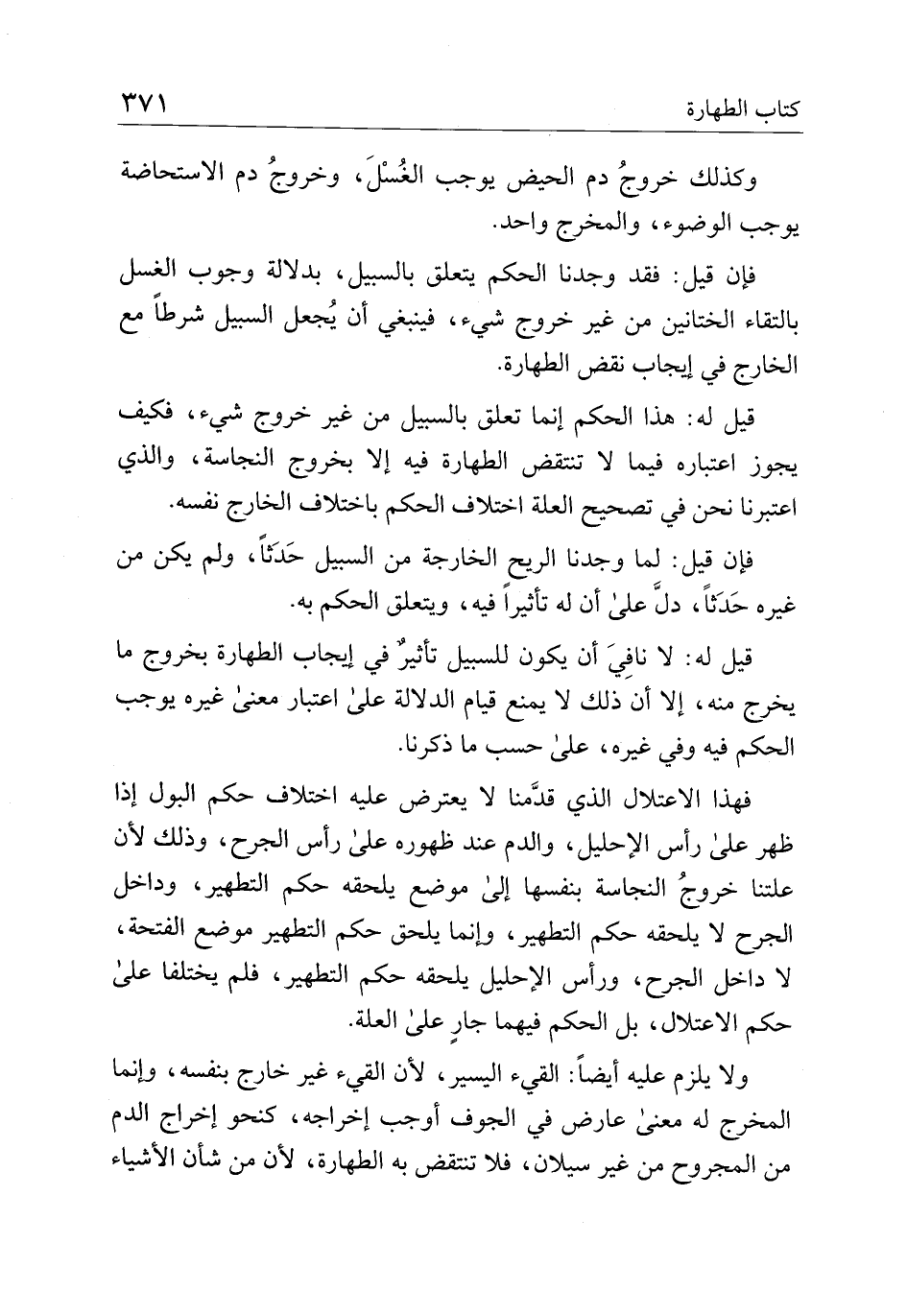 فهذا الاعتلال الذي قدمنا لا يعترض عليه اختلاف حكم البول إذا ظهر على رأس الإحليل، والدم عند ظهوره على رأس الجرح، وذلك لأن علتنا خروج النجاسة بنفسها إلى موضع يلحقه حكم التطهير، وداخل الجرح لا يلحقه حكم التطهير، وإنما يلحق حكم التطهير موضع الفتحة، لا داخل الجرح، ورأس الإحليل يلحقه حكم التطهير، فلم يختلفا على حكم الاعتلال، بل الحكم فيهما جار على العلة.