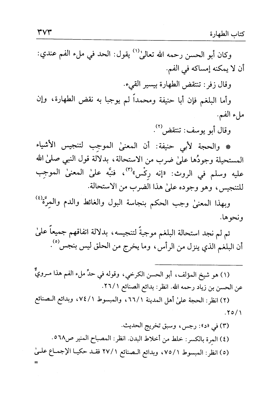 وأما البلغم فإن أبا حنيفة ومحمدًا لم يوجبا به نقض الطهارة، وإن ملء الفم.