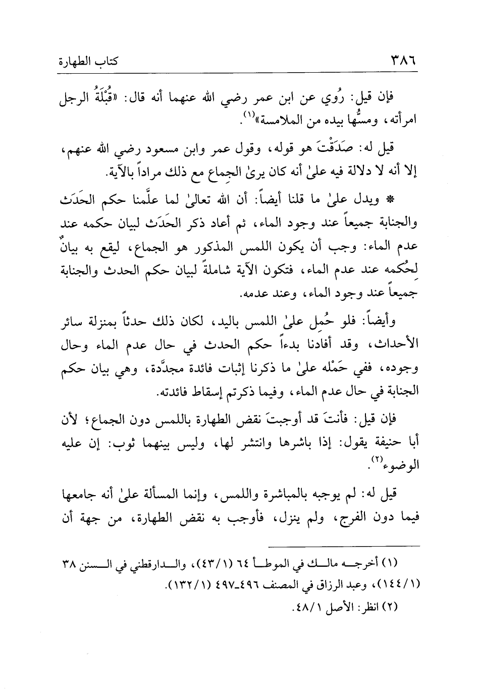 *ويدل على ما قلنا أيضًا: أن الله تعالى لما علمنا حكم الحدث والجنابة جميعاً عند وجود الماء، ثم أعاد ذكر الحدث لبيان حكمه عند عدم الماء: وجب أن يكون اللمس المذكور هو الجماع، ليقع به بيانٌ لحكمه عند عدم الماء، فتكون الآية شاملة لبيان حكم الحدث والجنابة جميعاً عند وجود الماء، وعند عدمه.