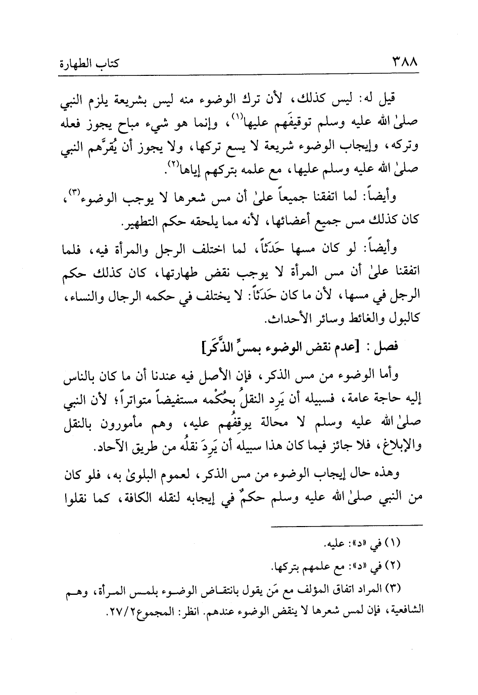 وأيضا: لو كان مسها حدثا، لما اختلف الرجل والمرأة فيه، فلما اتفقنا على أن مس المرأة لا يوجب نقض طهارتها، كان كذلك حكم الرجل في مسها، لأن ما كان حدثا: لا يختلف في حكمه الرجال والنساء، كالبول والغائط وسائر الأحداث.