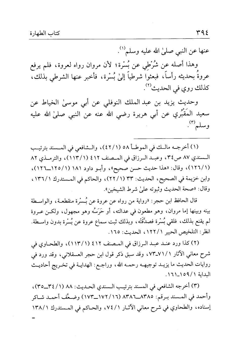 وهذا أثله عن شرطي عن بسرة؛ لأن مروان رواه لعروة، فلم يرفع عروة بحديثه رأسا، فبعثوا شرطيا إلى بسرة، فأخبر عنها لشرطي بذلك، كذلك روي في الحديث.