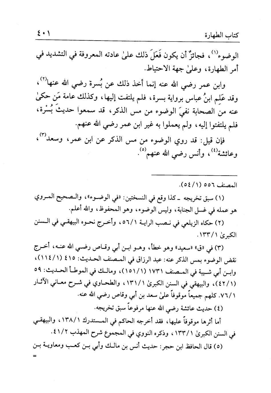 وابن عمر رضي الله عنه إنما أخذ ذلك عن بسرة رضي الله عنهما، وقد علم ابن عباس برواية بسرة، فلم يلتفت إليها، وكذلك عامة من حكى عنه من الصحابة نفي الوضوء من مس الذكر، قد سمعوا حديث بسرة، فلم يلتفتوا إليه، ولم يعلموا به غير ابن عمر رضي الله عنهم.