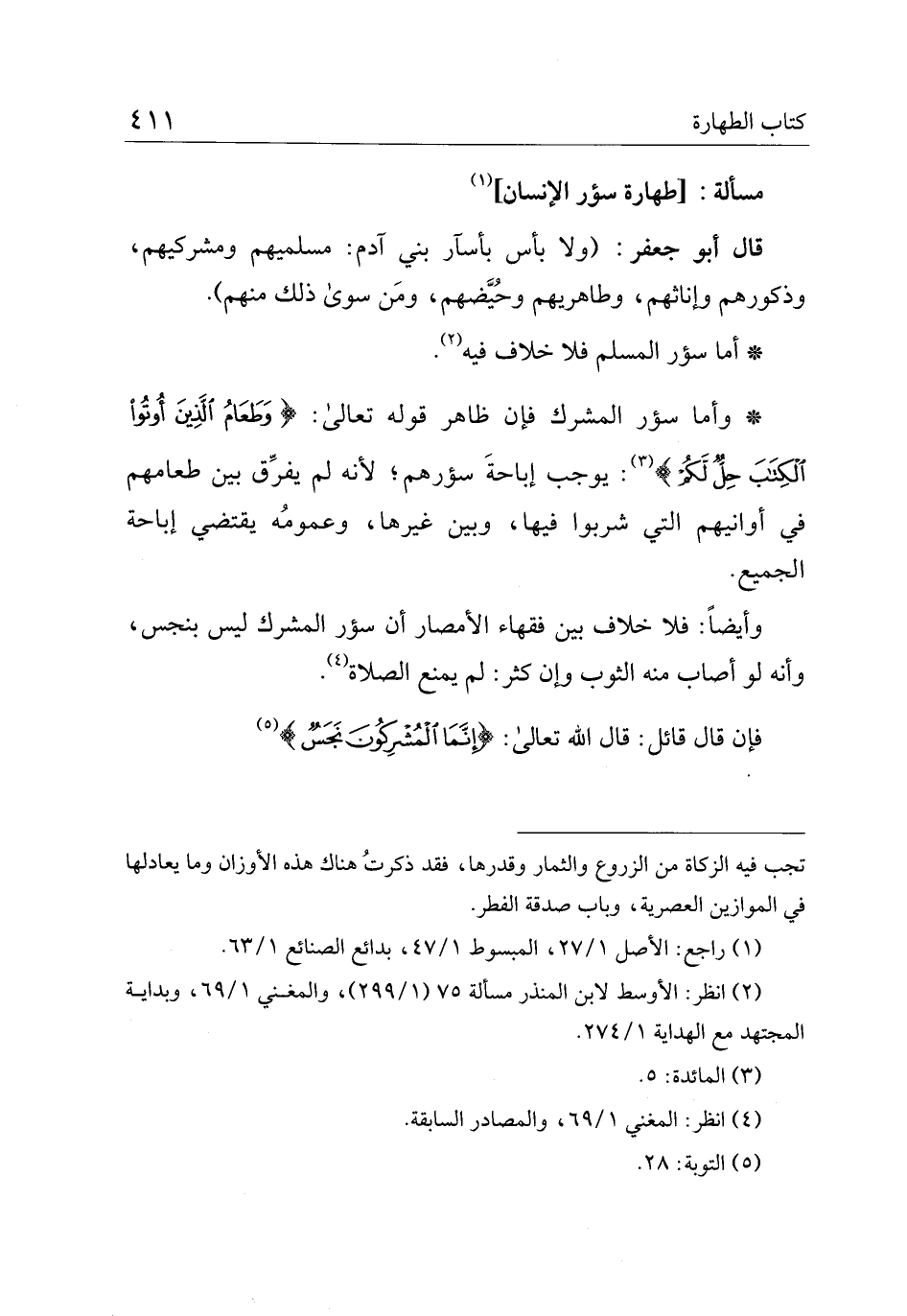 وأيضًا: فلا خاف بين فقهاء الأمصار أن سؤر المشرك ليس بنجس، وأنه لو أصاب منه الثوب وإن كثر: لم يمنع الصلاة".