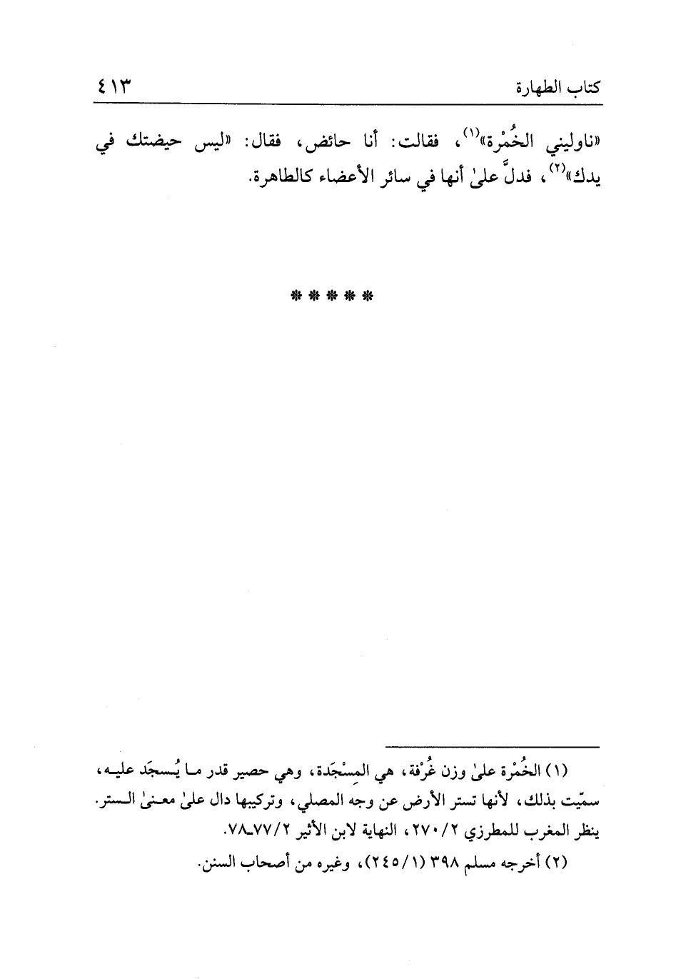 "ناوليني الخمرة"، فقالت: أنا حائض، فقال: "ليس حيضتك في بدك"، فدل على أنها في سائر الأعضاء كالطاهرة.