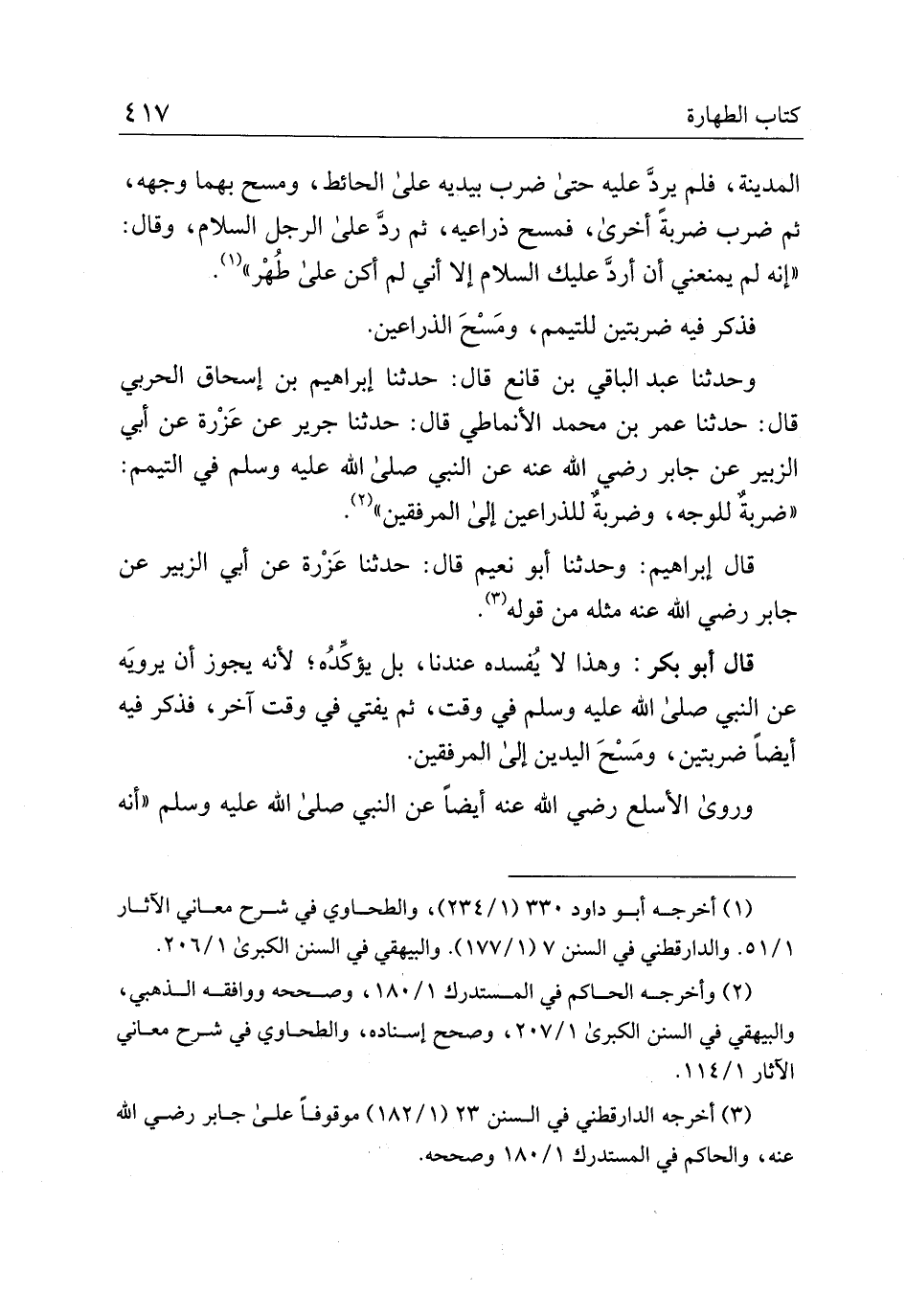 وحدثنا عبد الباقي بن قانع قال: حدثنا إبراهيم بن إسحاق الحربي قال: حدثنا عمر بن محمد الأنماطي قال: حدثنا جرير عن عزرة عن أبي الزبير عن جابر رضي الله عنه عن النبي صلى الله عليه وسلم في التيمم: "ضربة للوجه، وضربة للذراعين إلى المرفقين".
