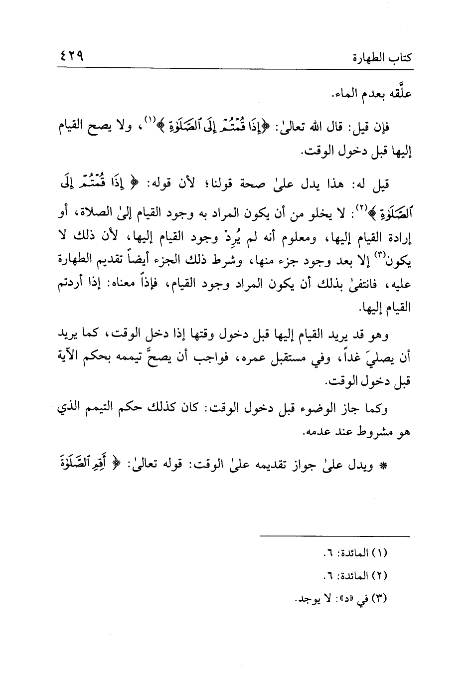 قيل له: هذا يدل على صحة قولنا؛ لأن قوله: {إِذَا قُمْتُمْ إِلَى الصَّلاةِ}: لا يخلو من أن يكون المراد به وجود القيام إلى الصلاة، أو إرادة القيام إليها، ومعلوم أنه لم يرد وجود القيام إليها، لن ذلك لا يكون إلا بعد وجود جزء منها، وشرط ذلك الجزء أيضًا تقديم الطهارة عليه، فانتفى بذلك أن يكون المراد وجود القيام، فإذا معناه: إذا أردتم القيام إليها.