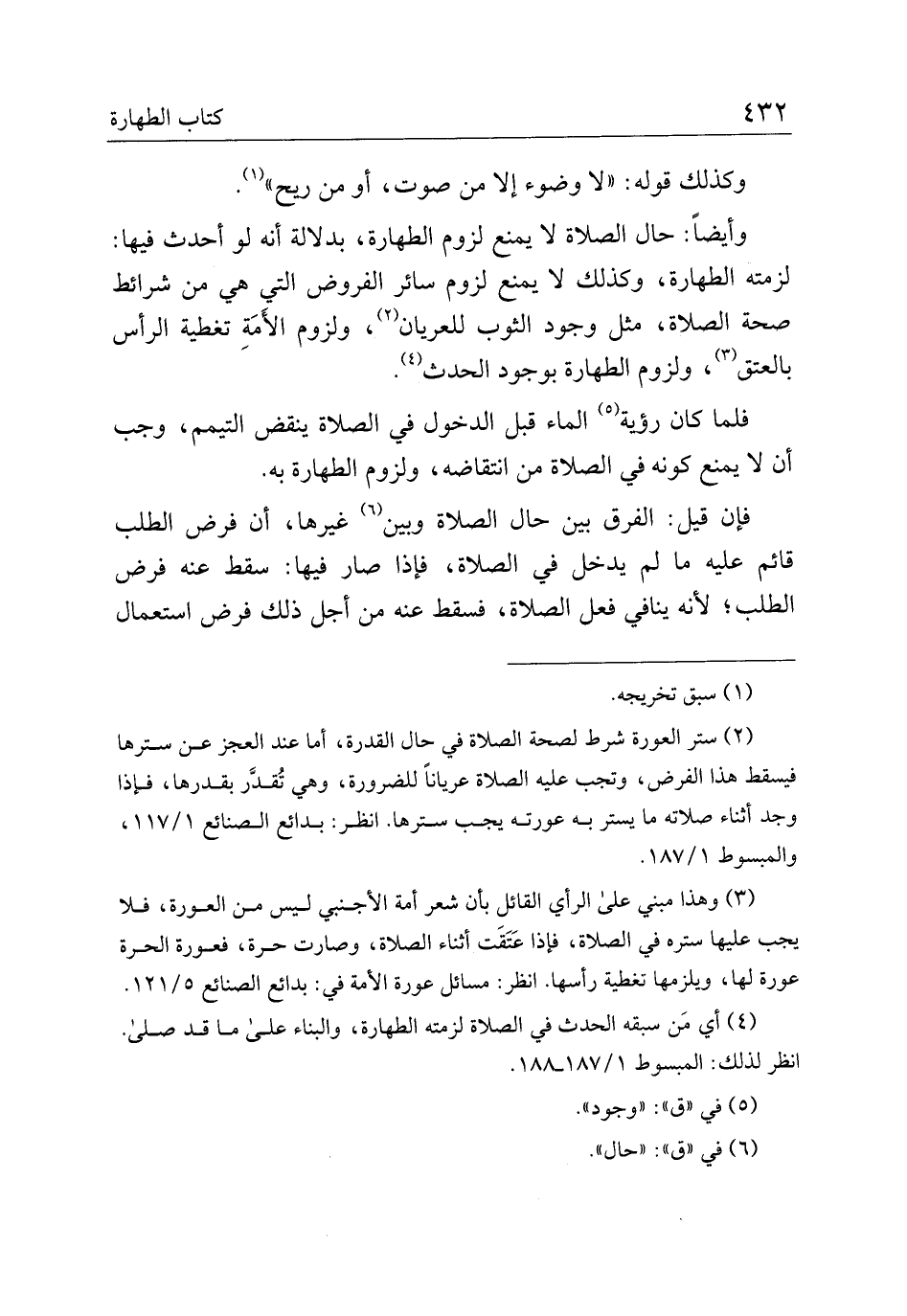 وأيضًا: حال الصلاة لا يمنع لزوم الطهارة، بدلالة أنه لو أحدث فيها لزمته الطهارة، وكذلك لا يمنع لزوم سائر الفروض التي هي من شرائط صحة الصلاة، مثل وجود الثوب للعريان، ولزوم الأمة تغطية الرأس بالعتق، ولزوم الطهارة بوجود الحدث.