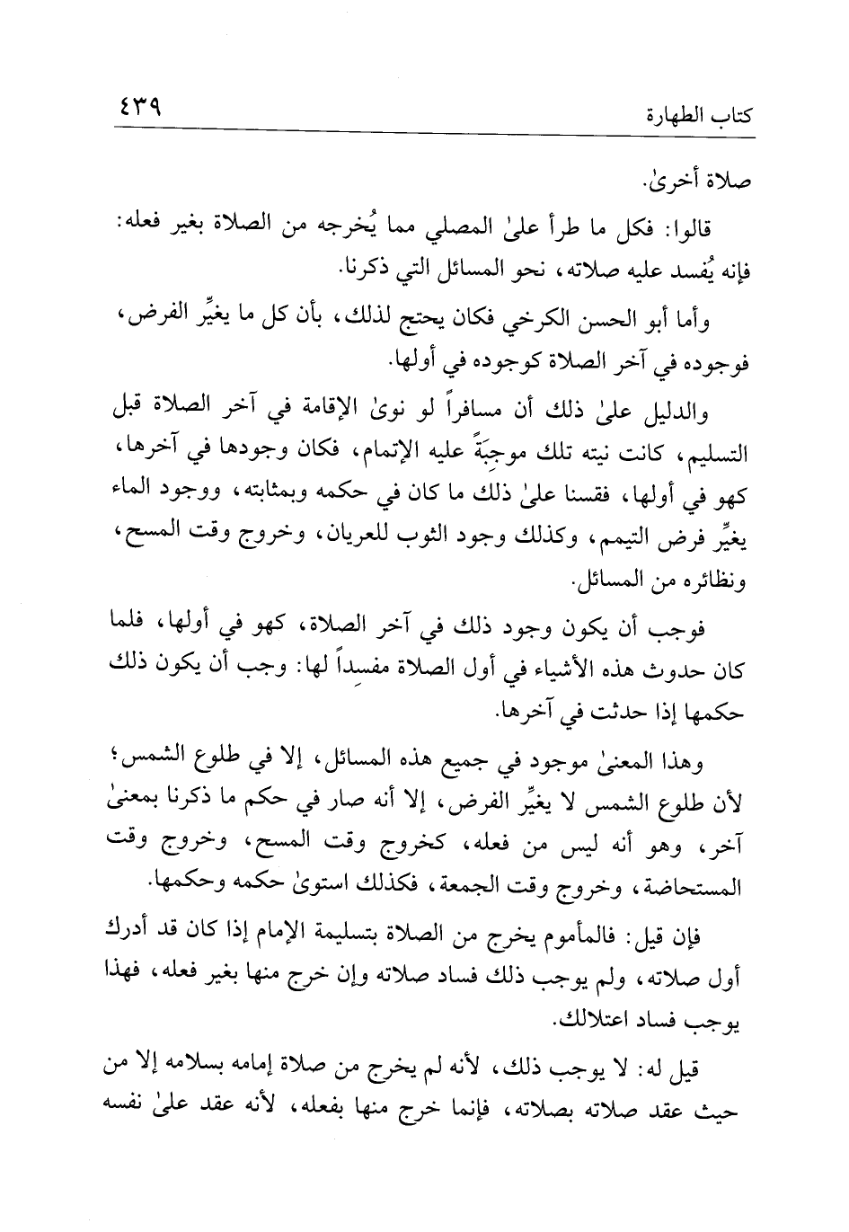 فوجب أن يكون وجود ذلك في آخر الصلاة، كهو في أولها، فلما كان حدوث هذه الأشياء في أول الصلاة مفسدًا لها: وجب أن يكون ذلك حكمها إذا حدثت في آخرها.