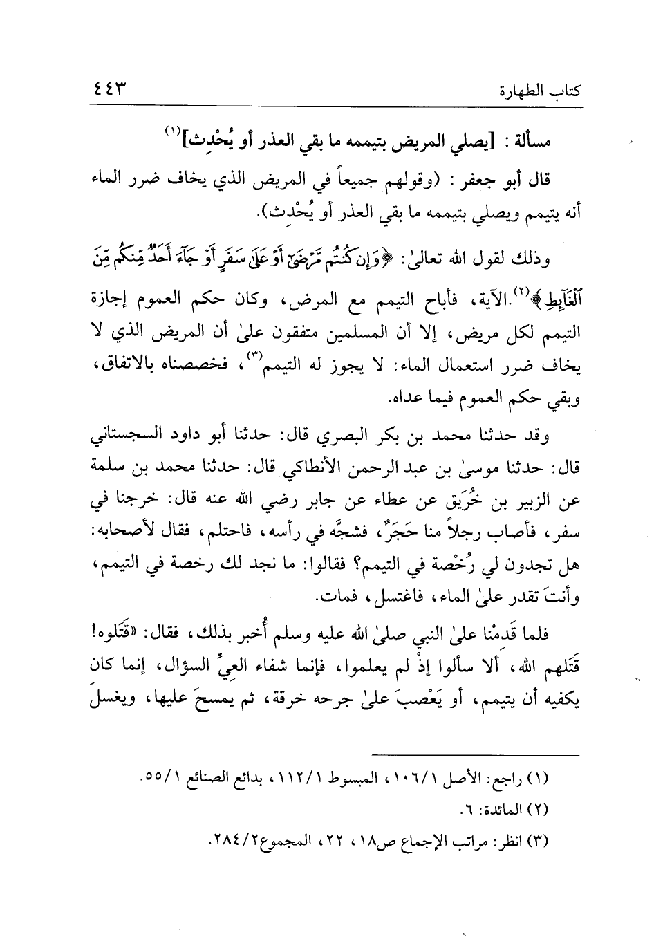 وقد حدثنا محمد بن بكر البصري قال: حدثنا أبو داود السجستاني قال: حدثنا موسى بن عبد الرحمن الأنطاكي قال: حدثنا محمد بن سلمة عن الزبير بن خريق عن عطاء عن جابر رضي الله عنه قال: خرجنا في سفر، فأصاب رجلًا منا حجر، فشجه في رأسه، فاحتلم، فقال لصحابه: هل تجدون لي رخصة في التيمم؟ فقالوا: ما نجد لك رخصة في التيمم، وأنت تقدر على الماء، فاغتسل، فمات.