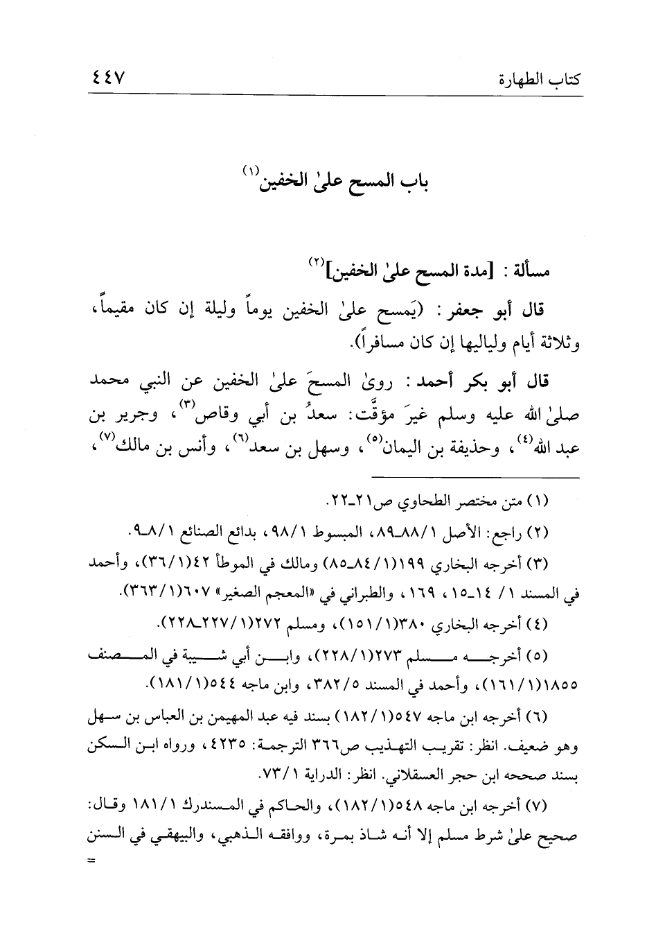 قال أبو جعفر: (يمسح على الخفين يومًا وليلة إن كان مقيمًا، وثلاثة أيام ولياليها إن كان مسافرًا).