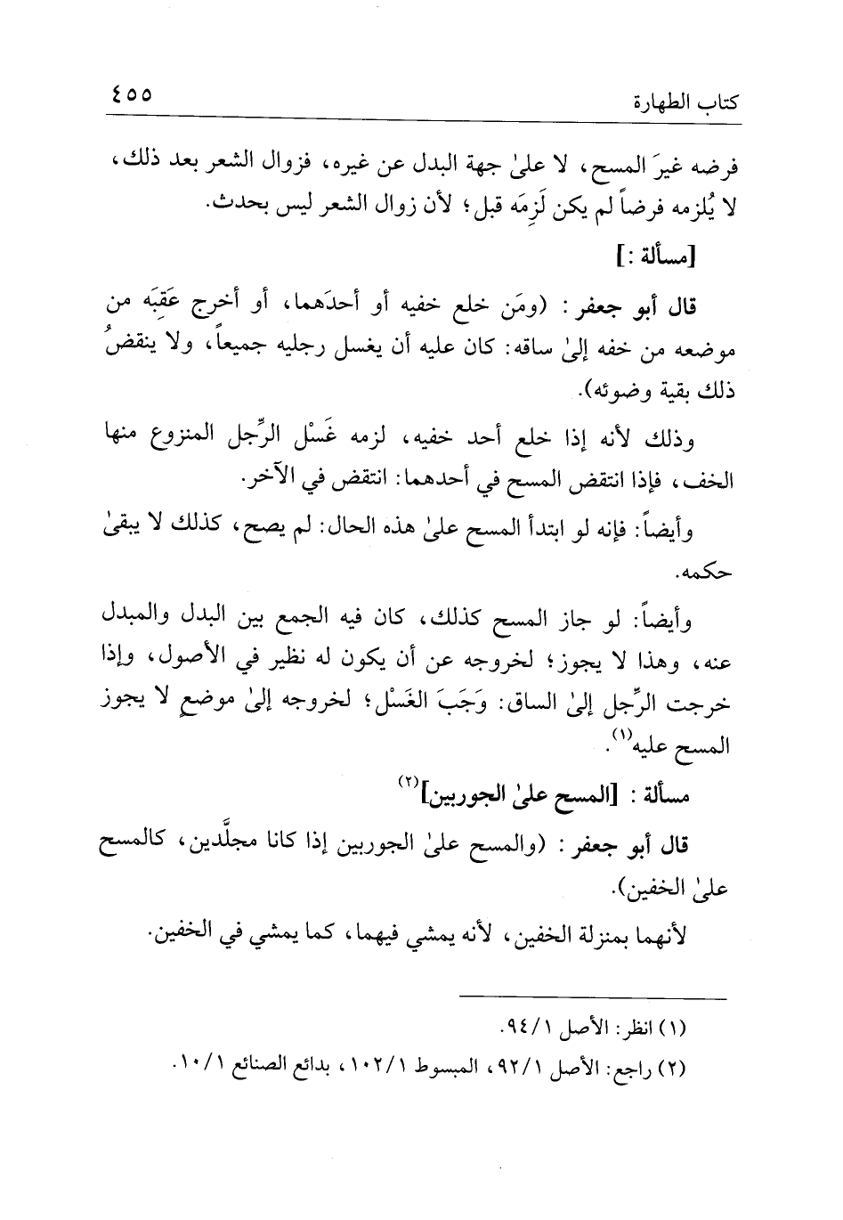 قال أبو جعفر: (والمسح على الجوربين إذا كانا مجلدين، كالمسح على الخفين).