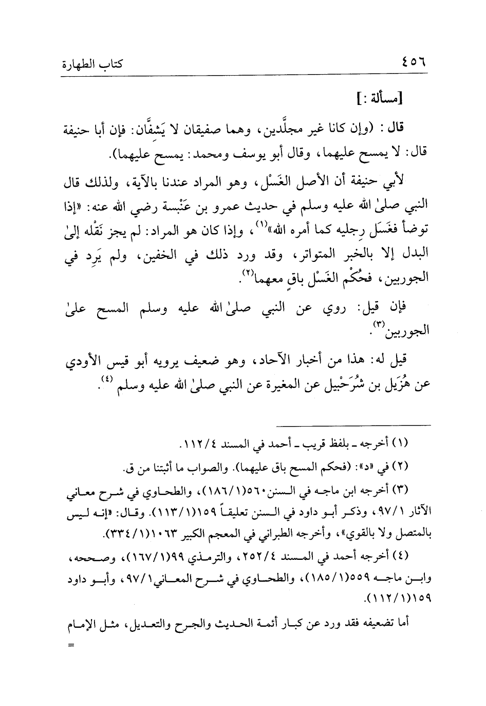 لأبي حنيفة أن الأصل الغسل، وهو المراد عندنا بالآية، ولذلك قال النبي صلى الله عليه وسلم في حديث عمرو بن عنبسة رضي الله عنه: "توضأ فغسل رجليه كما أمره الله"، وإذا كان هو المراد: لم يجز نقله إلى البدل إلا بالخبر المتواتر، وقد ورد ذلك في الخفين، ولم يرد في الجوريين، فحكم الغسل باق معهما.