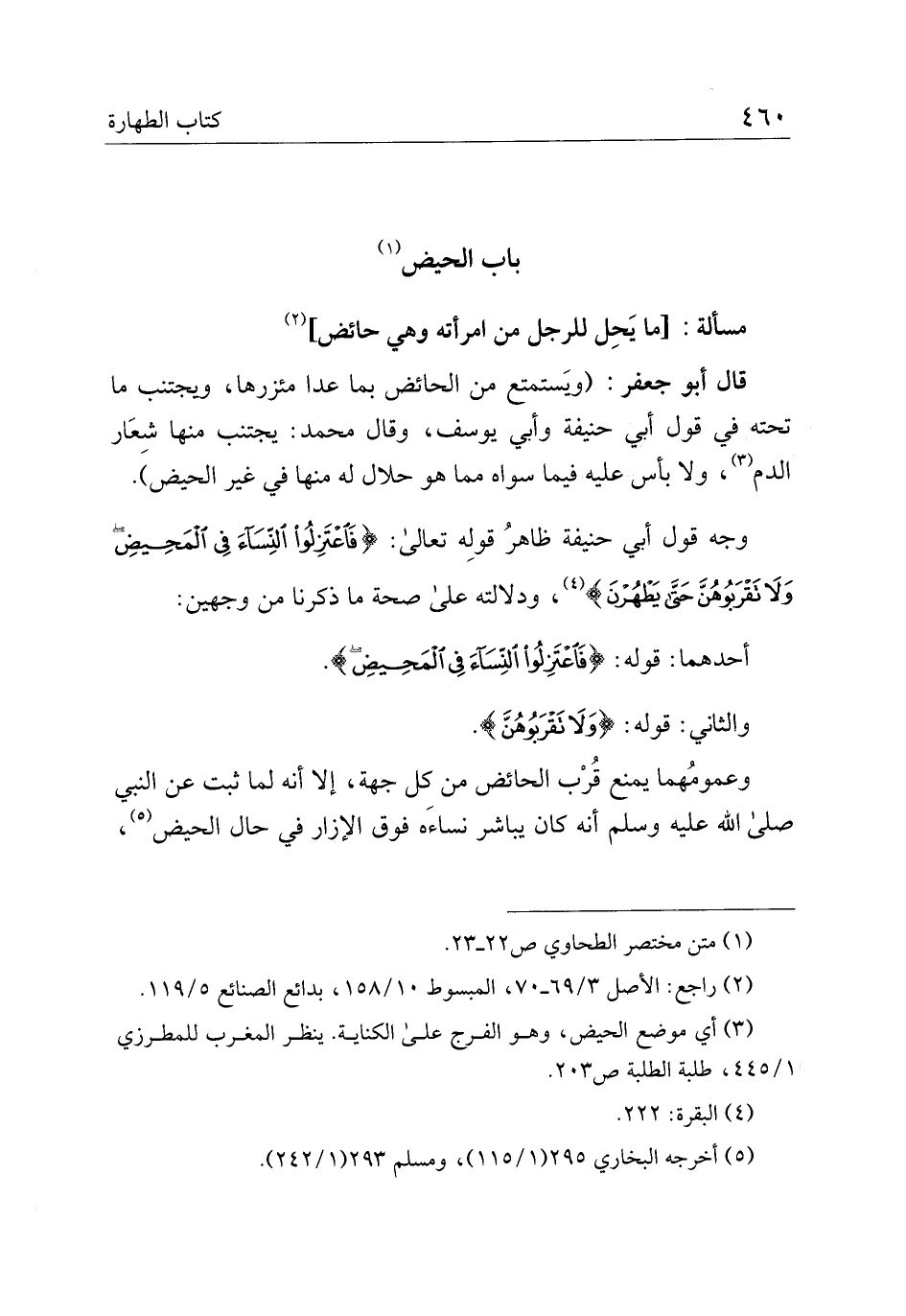 قال أبو جعفر: (ويستمتع من الحائض بما عدا مئزرها، ويجتنب مل تحته في قول أبي حنيفة وأبي يوسف، وقال محمد: يجتنب منها شعر الدم، ولا بأس عليه فيما سواه مما هو حلال له منها في غير الحيض).