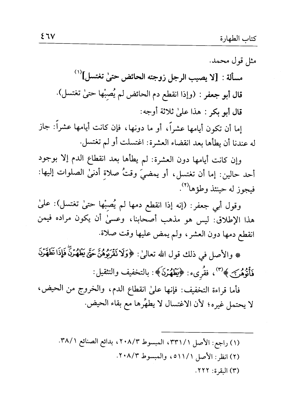* والأصل في ذلك قوله الله تعالى: {وَلا تَقْرَبُوهُنَّ حَتَّى يَطْهُرْنَ فَإِذَا تَطَهَّرْنَ فَأْتُوهُنَّ}، فقرئ: {يَطْهُرْنَ}: بالتخفيف والتثقيل: