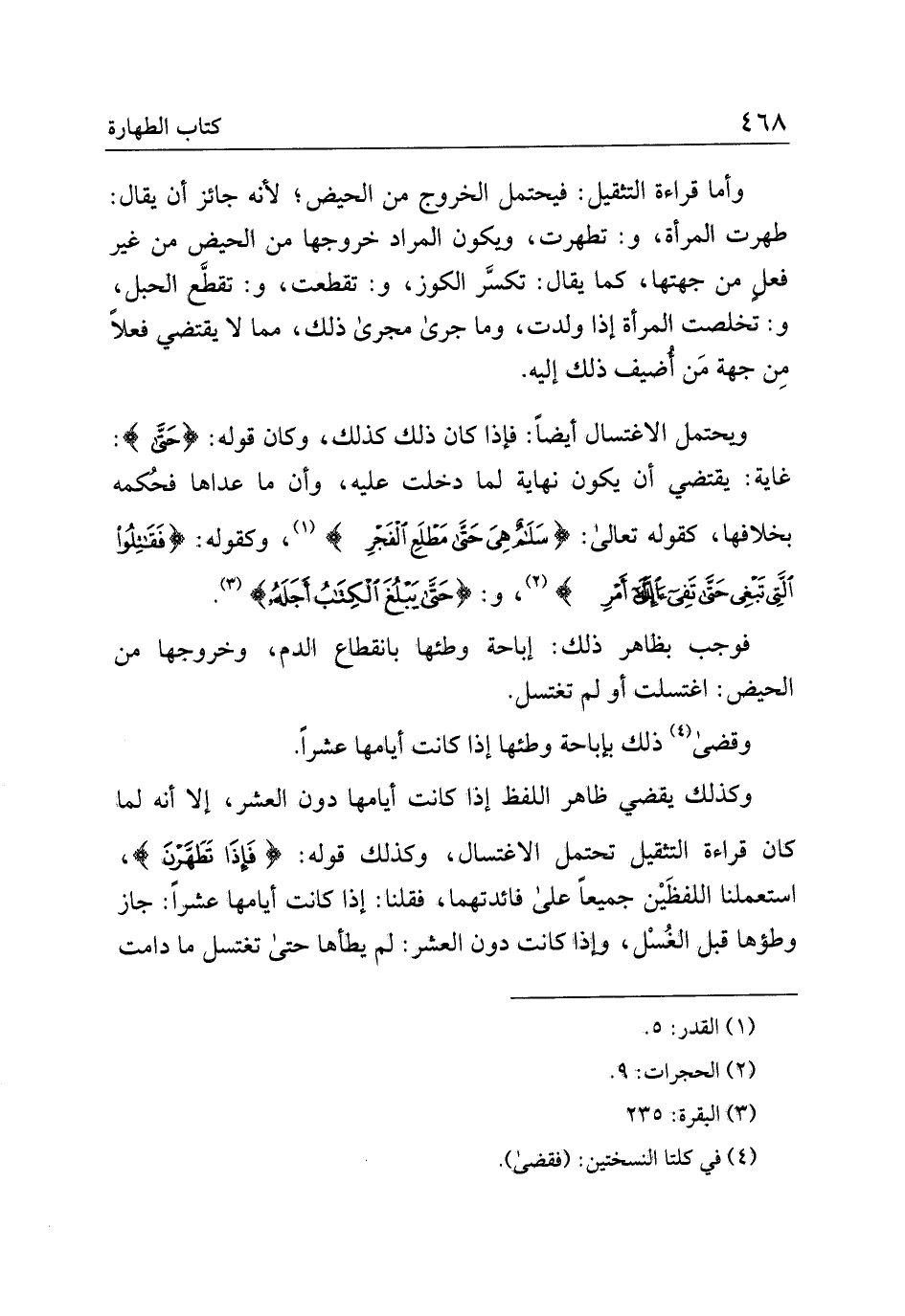 وأما قراءة التثقيل: فيحتمل الخروج من الحيض؛ لأن جائز أن يقال طهرت المرأة، و: تطهرت، ويكون المراد خروجها من الحيض من غير فعل من جهتها، كما يقال: تكسر الكوز، و: تقطعت، و: تقطع الحبل، و: تخلصت المرأة إذا ولدت، وما جرى مجرى ذلك، مما لا يقتضي فعلًا من جهة من أضيف ذلك إليه.