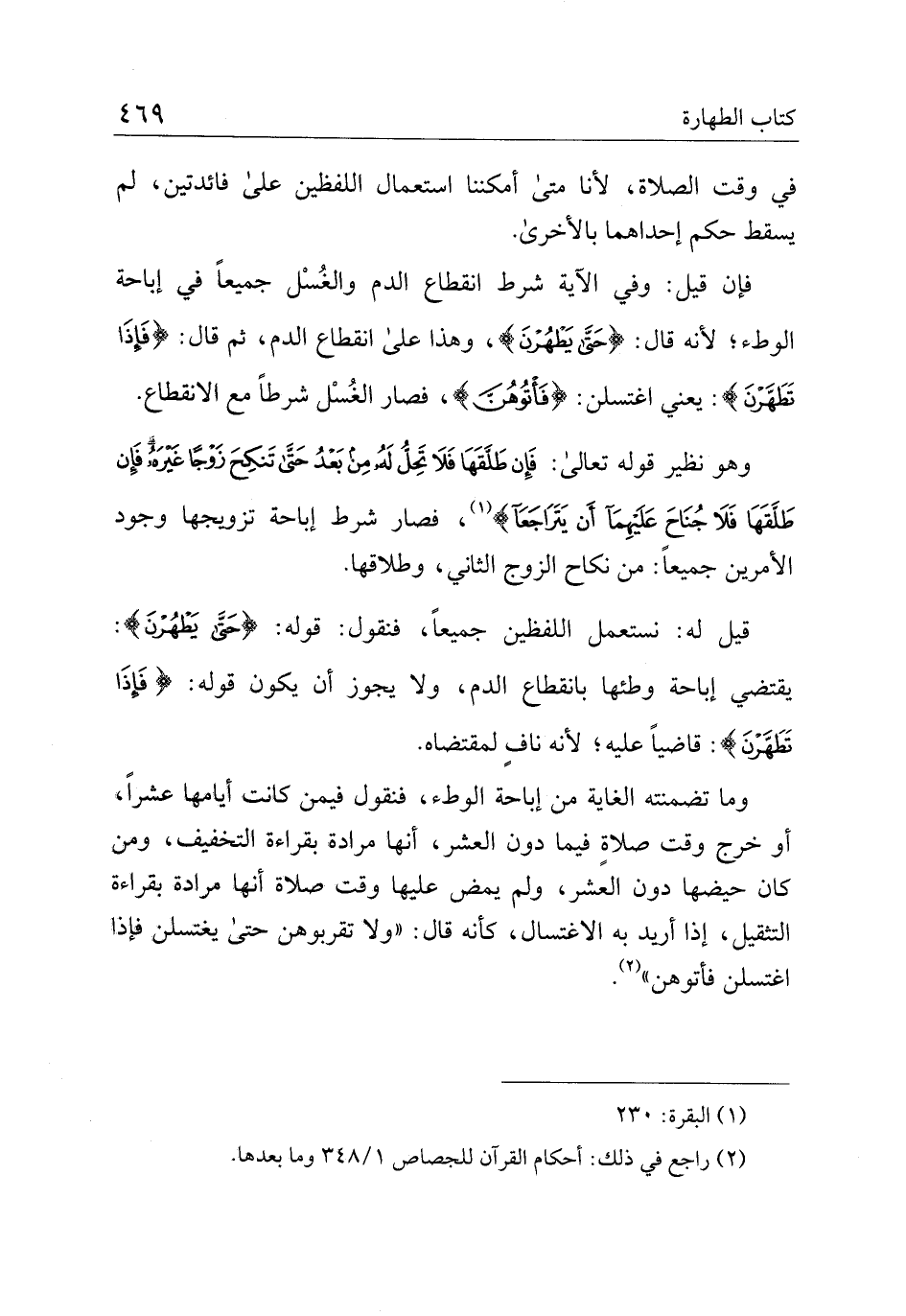 قيل له: نستعمل اللفظين جميعًا، فنقول: قوله: {حَتَّى يَطْهُرْنَ}: يقتضي إباحة وطئها بانقطاع الدم، ولا يجوز أن يكون قوله: {فَإِذَا تَطَهَّرْنَ}:: قاضيًا عليه، لأنه ناف لمقتضاه.