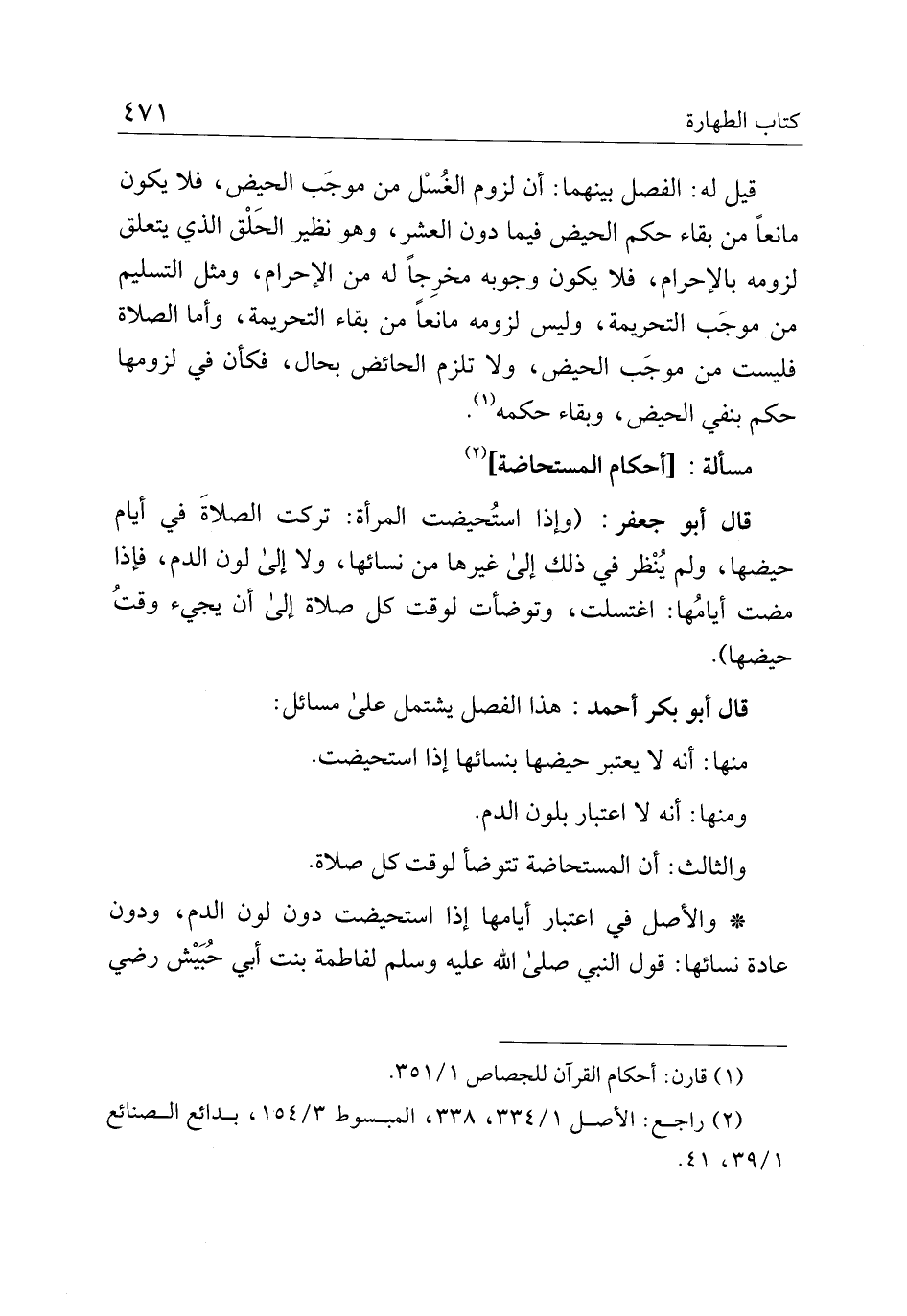 قال أبو جعفر: (وإذا استحيضت المرأة: تركت الصلاة في أيام حيضها، ولم ينظر في ذلك إلى غيرها من نسائها، ولا إلى لون الدم، فإذا مضت أيامها: اغتسلت، وتوضأت لوقت كل صلاة إلى أن يجيء وقت حيضها).