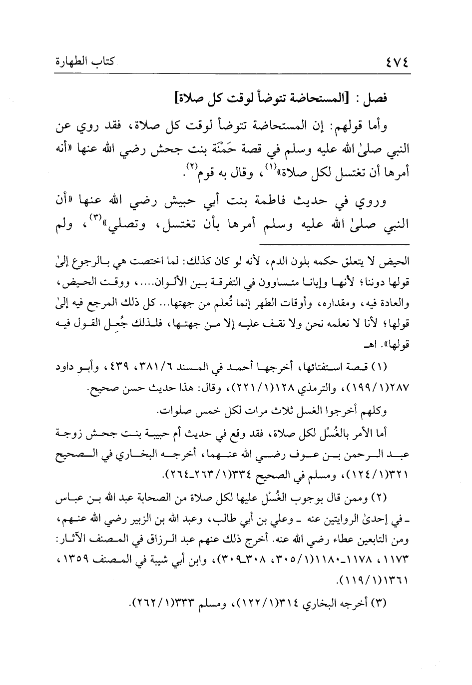 وأما قولهم: إن المستحاضة تتوضأ لوقت كل صلاة، فقد روي هم النبي صلى الله عليه وسلم في قصة حمنة بنت جحش رضي الله عنها "أنه أمرها أن تغتسل لكل صلاة"، وقال به قوم.