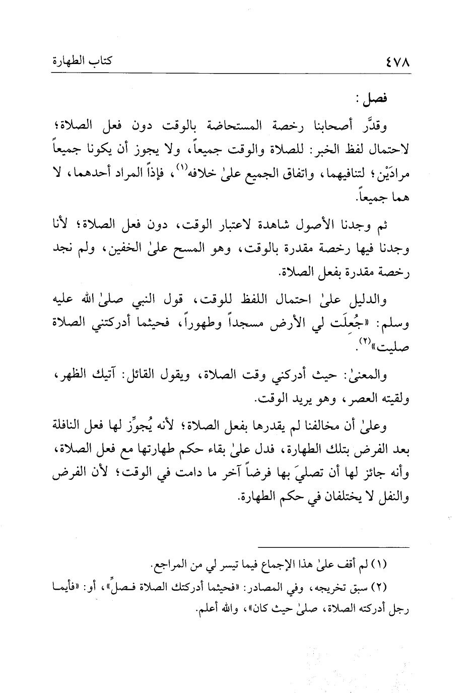 ثم وجدنا الأصول شاهدة لاعتبار الوقت، دون فعل الصلاة؛ لأن وجدنا فيها رخصة مقدرة بالوقت، وهو المسح على الخفين، ولم نجد رخصة مقدرة بفعل الصلاة.
