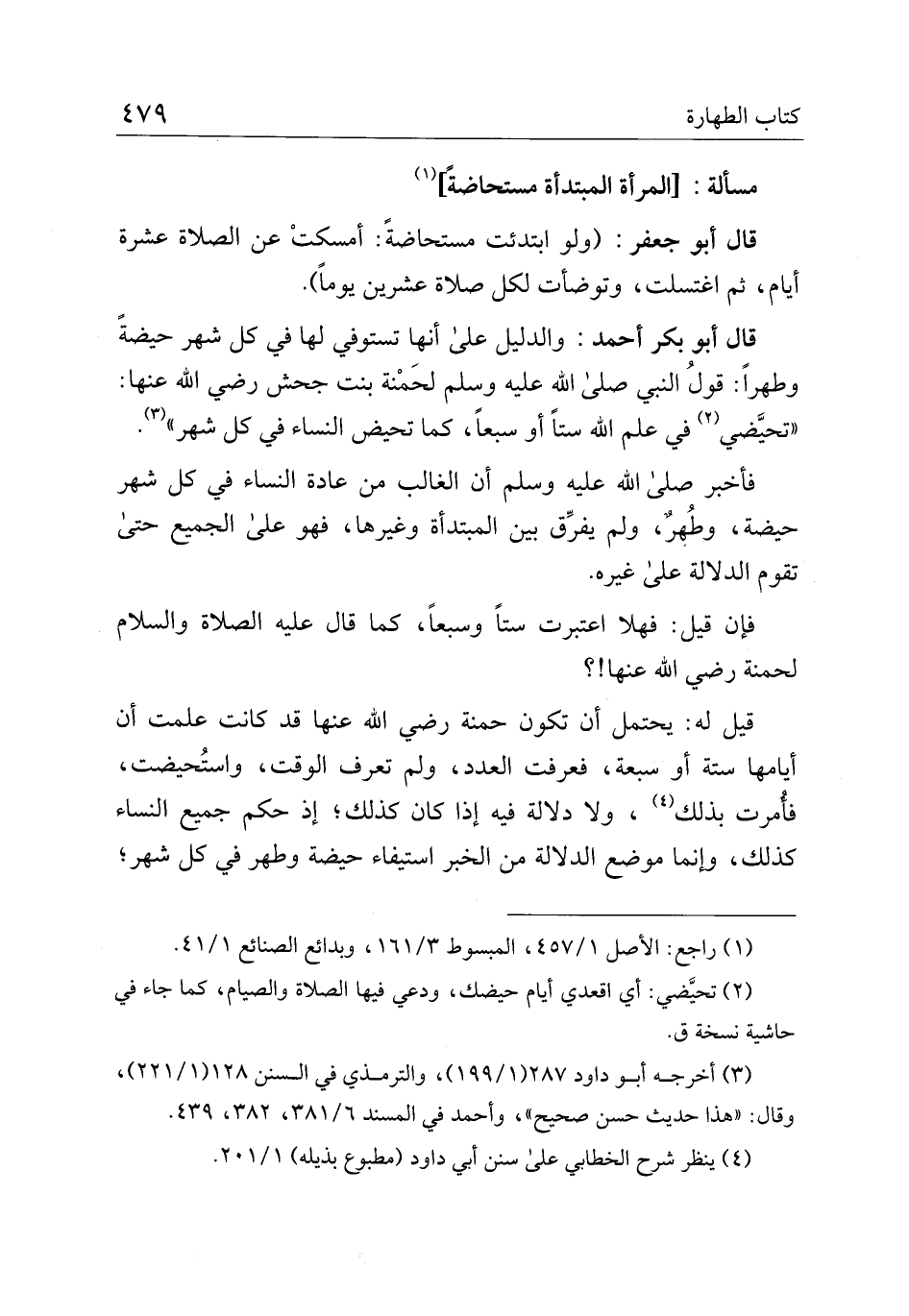 قال أبو بكر أحمد: والدليل على أنها تستوفي لها في كل شهر حيضة وطهرًا: قول النبي صلى الله عليه وسلم لحمنة بنت جحش رضي الله عنها: "تحيضي في علم الله ستًا أو سبعًا، كما تحيض النساء في كل شهر".