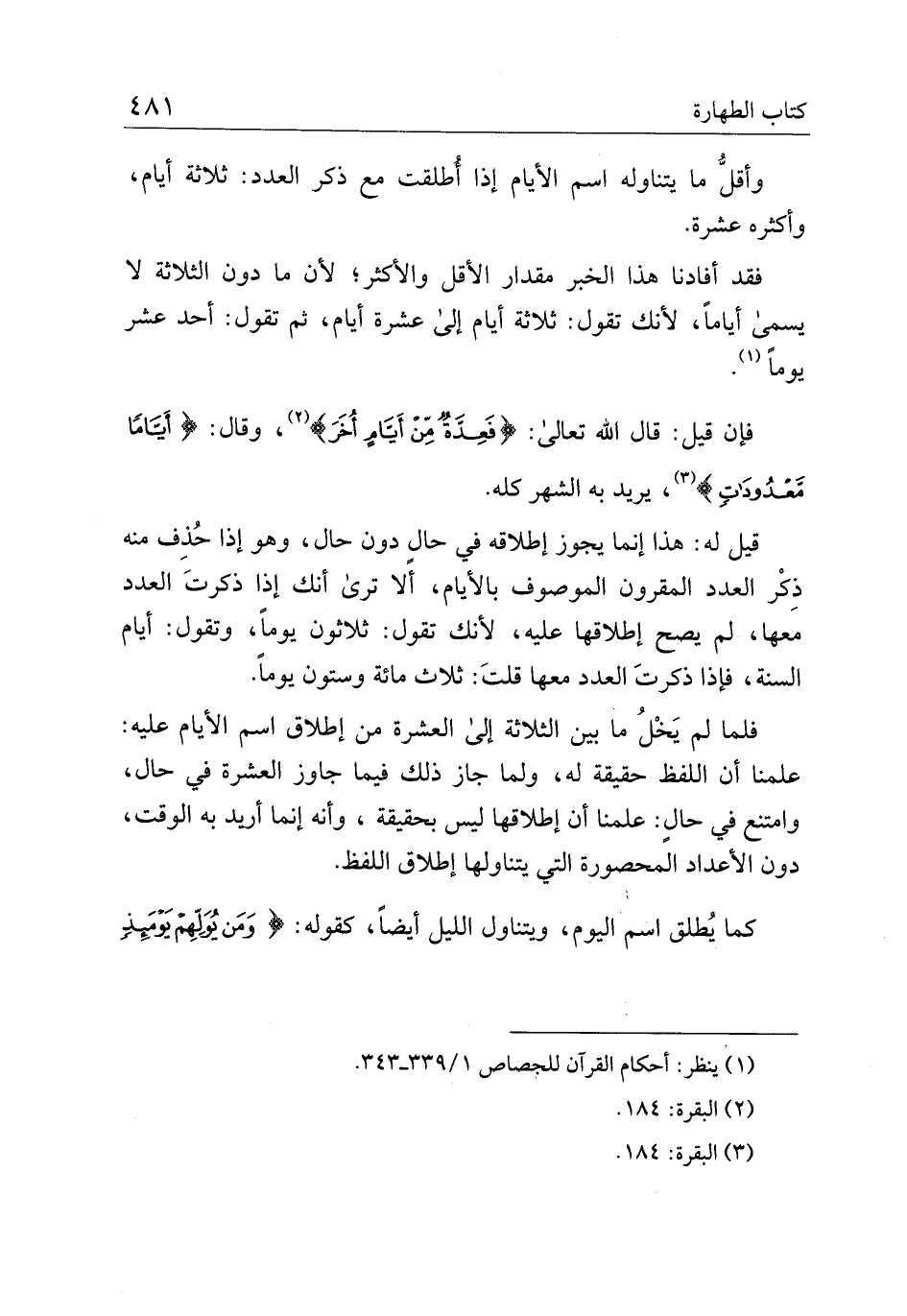 قيل له: هذا غنما يجوز إطلاقه في حال دون حال، وهو إذا حذف منه ذكر العدد المقرون الموصوف بالأيام، ألا ترى أنك إذا ذكرت العدد معها، لم يصح إطلاقها عليه، لأنك تقول: ثلاثون يومًا، وتقول: أيام السنة، فإذا ذكرت العدد معها قلت: ثلاث مائة وستون يومًا).