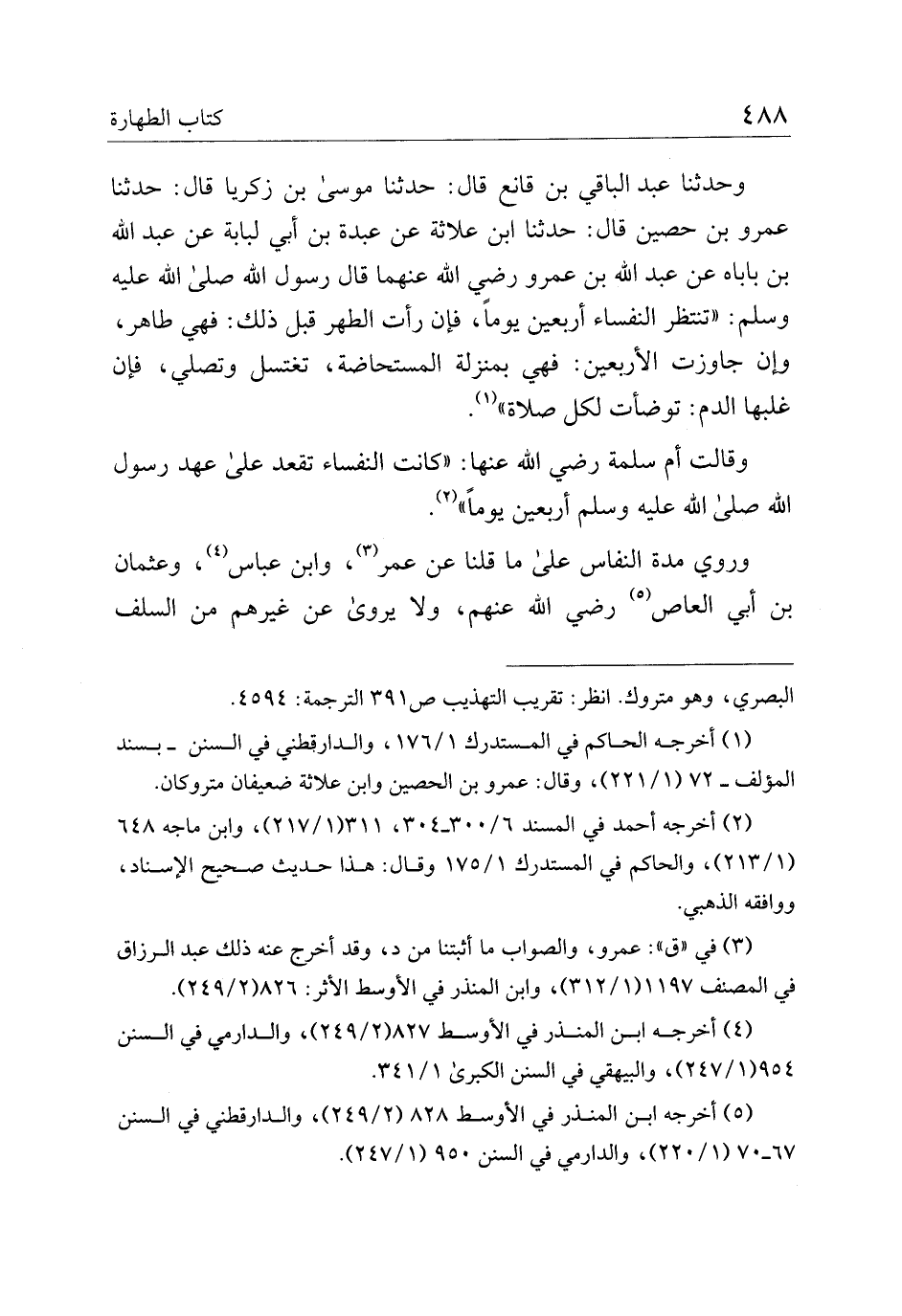 وحدثنا عبد الباقي بن قانع قال: حدثنا موسى بن زكريا قال: حدثنا عمرو بن حصين قال: حدثنا ابن علاثة عن عبدة بن أبي لبابة عن عبد الله بن باباه عن عبد الله بن عمرو رضي عنهما قال رسول الله صلى الله عليه وسلم: "تنتظر النفساء أربعين يومًا، فإن رأت الطهر قبل ذلك: فهي طاهر، وإن جاوزت الأربعين: فهي بمنزلة المستحاضة، تغتسل وتصلي، فإن غلبها الدم: توضأت لكل صلاة".