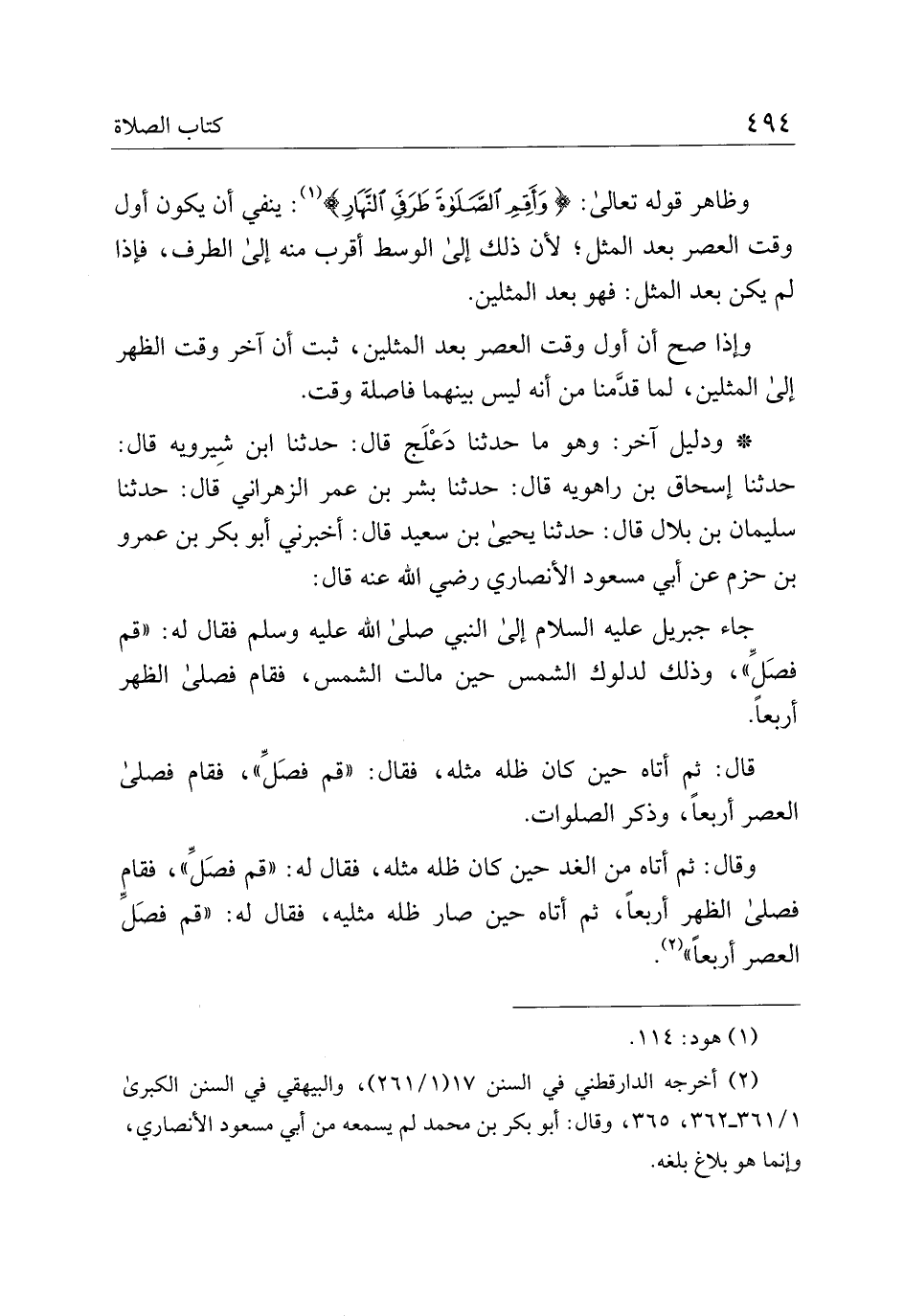 وظاهر قوله تعالى: {وَأَقِمِ الصَّلاةَ طَرَفِيِ النَّهَارِ}: ينفي أن يكون أول وقت العصر بعد المثل؛ لأن ذلك إلى الوسط أقرب منه إلى الطرف، فإذا أول وقت العصر بعد المثل؛ لأن ذلك إلى الوسط أقرب منه إلى الطرف، فإذا لم يكن بعد المثل: فهو بعد المثلين.